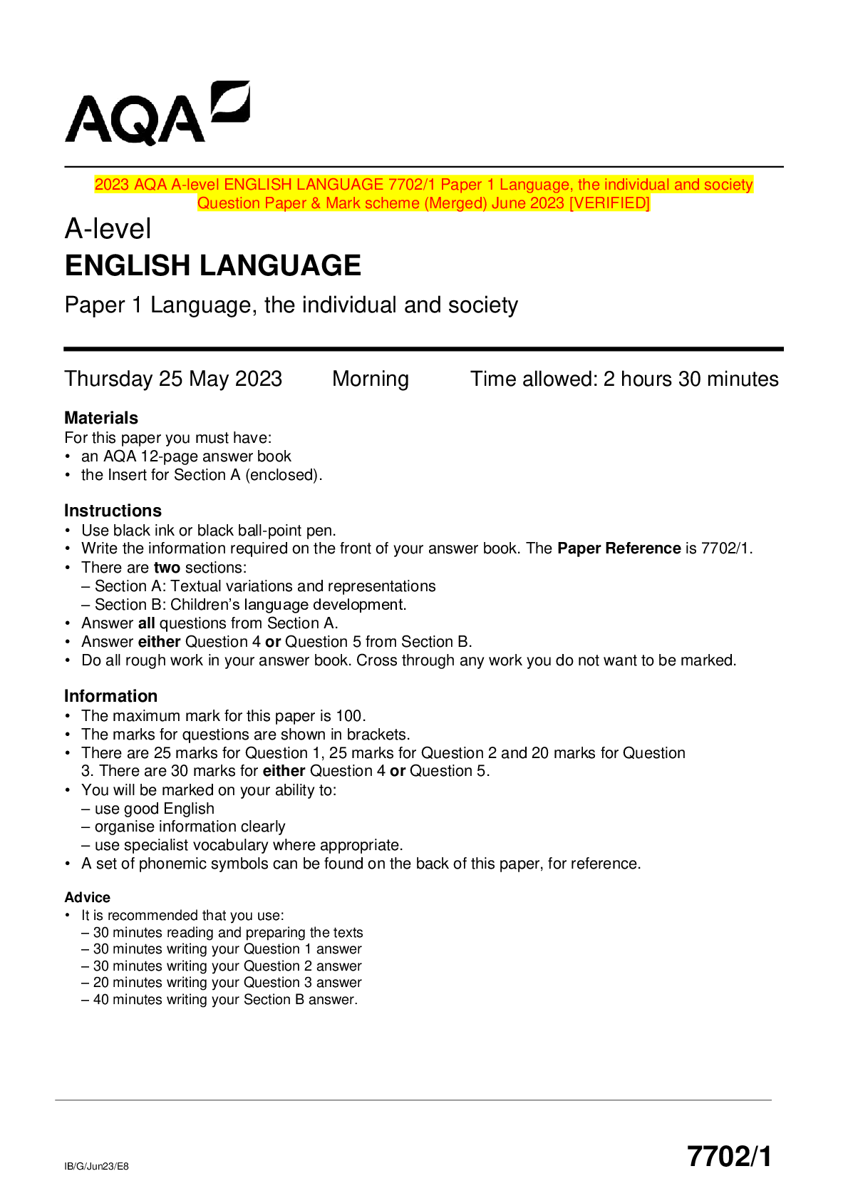 AQA > AQA QUESTION and MARK SCHEMES > 2023 AQA A-level ENGLISH LANGUAGE 7702/1 Paper 1 Language, the individual and society Question Paper & Mark scheme (Merged) June 2023 [VERIFIED] (All)