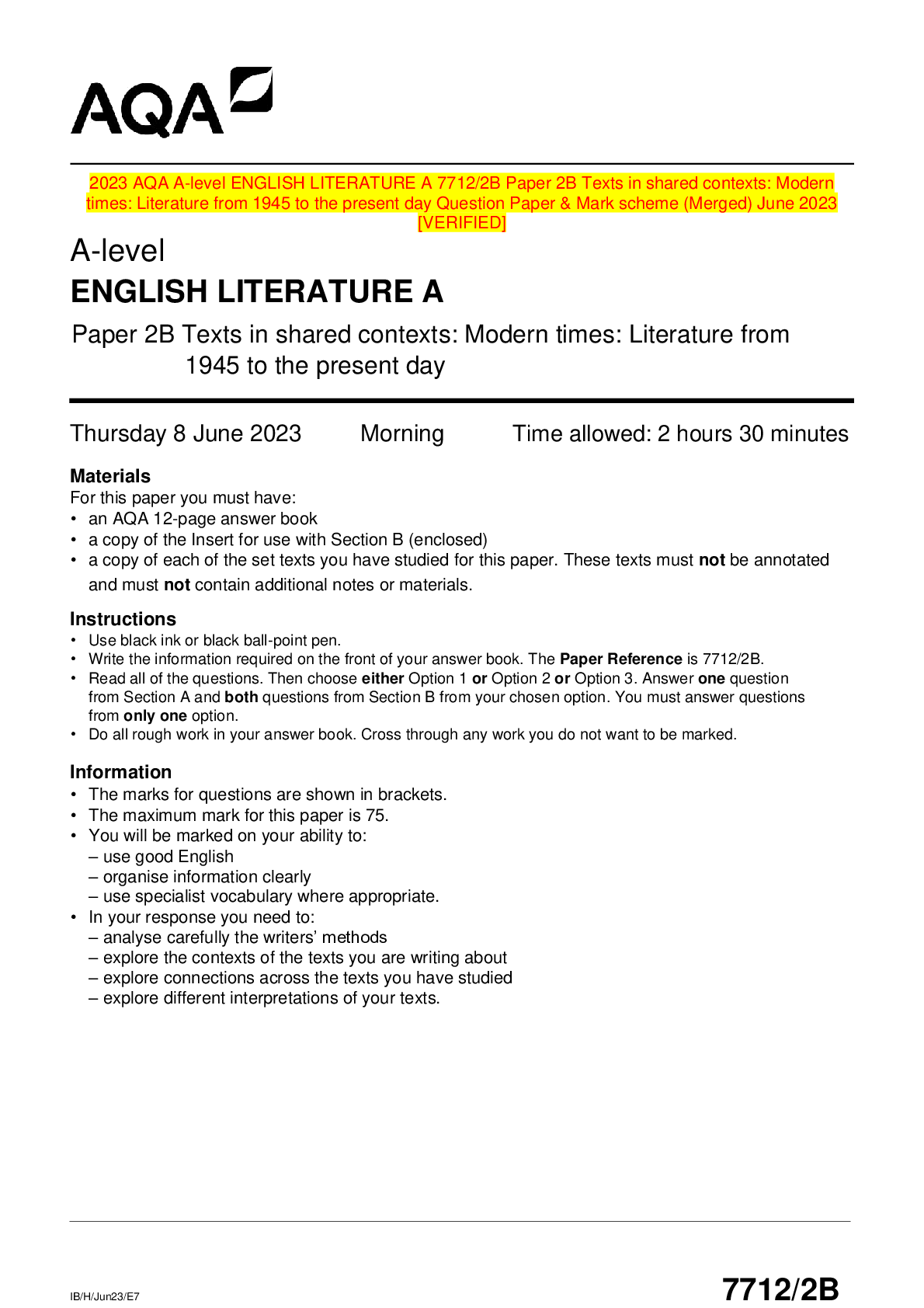 AQA > AQA QUESTION and MARK SCHEMES > 2023 AQA A-level ENGLISH LITERATURE A 7712/2B Paper 2B Texts in shared contexts: Modern times: Literature from 1945 to the present day Question Paper & Mark scheme (Merged) June 2023 [VERIFIED (All)