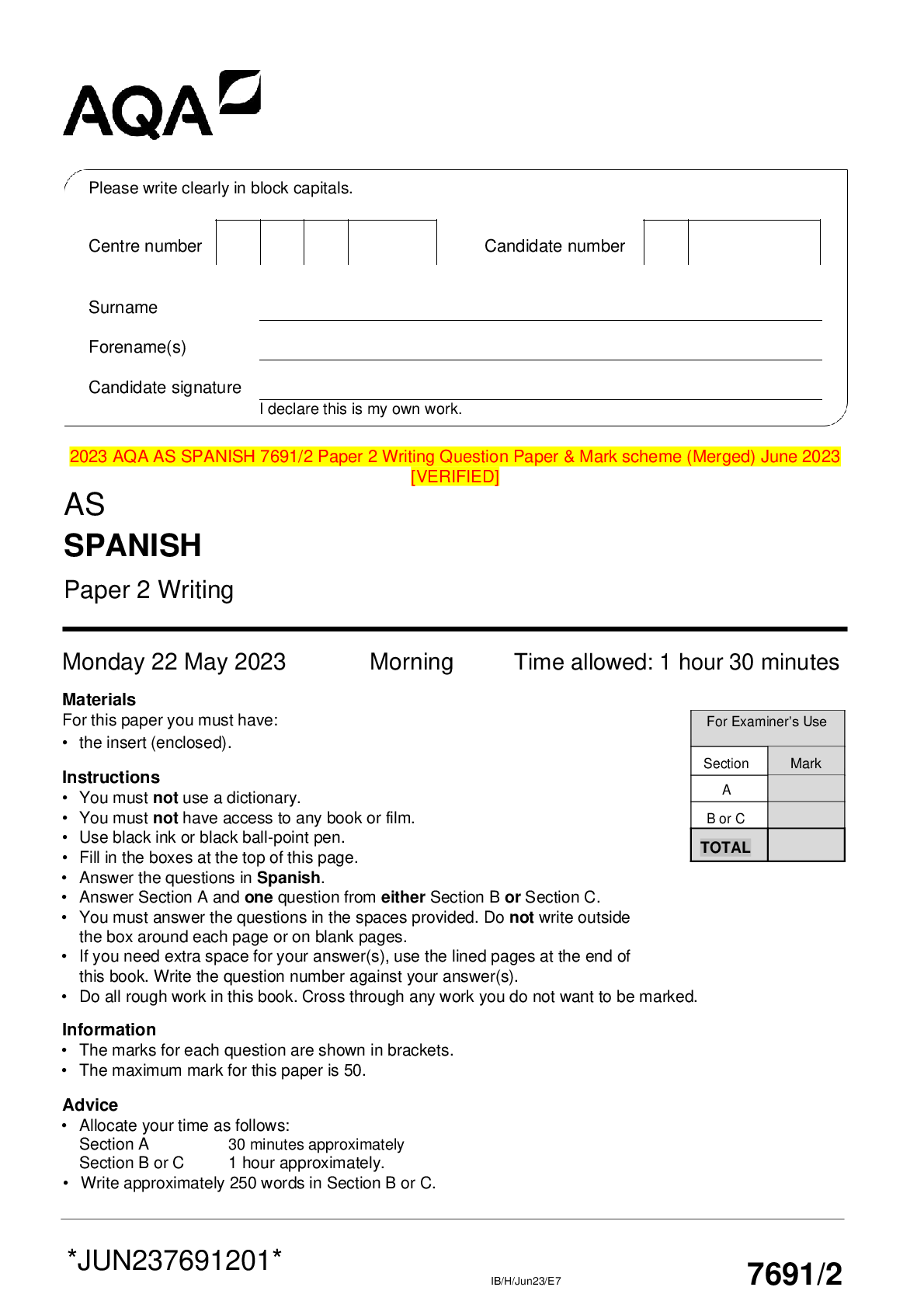 AQA > AQA QUESTION and MARK SCHEMES > 2023 AQA AS SPANISH 7691/2 Paper 2 Writing Question Paper & Mark scheme (Merged) June 2023 [VERIFIED] (All)