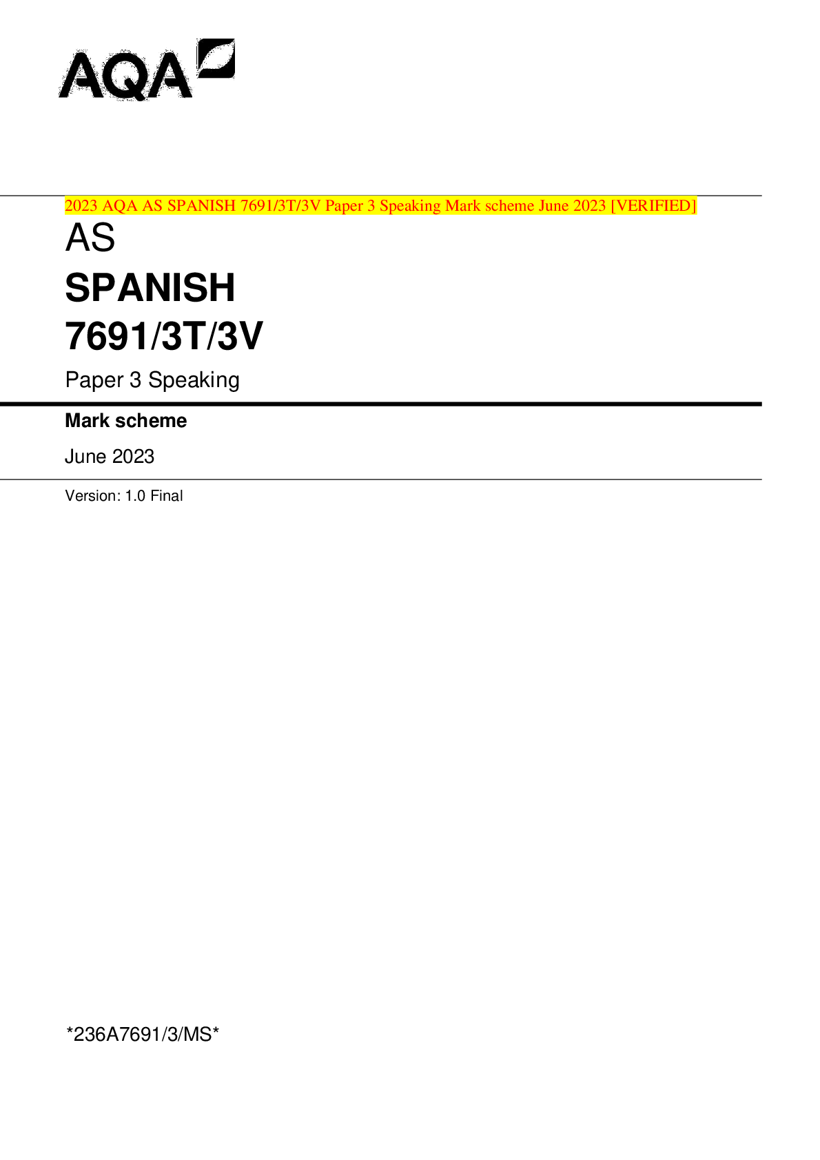 AQA > AQA QUESTION and MARK SCHEMES > 2023 AQA AS SPANISH 7691/1 Paper 1 Listening, Reading and Writing Question Paper & Mark scheme (Merged) June 2023 [VERIFIED] (All)