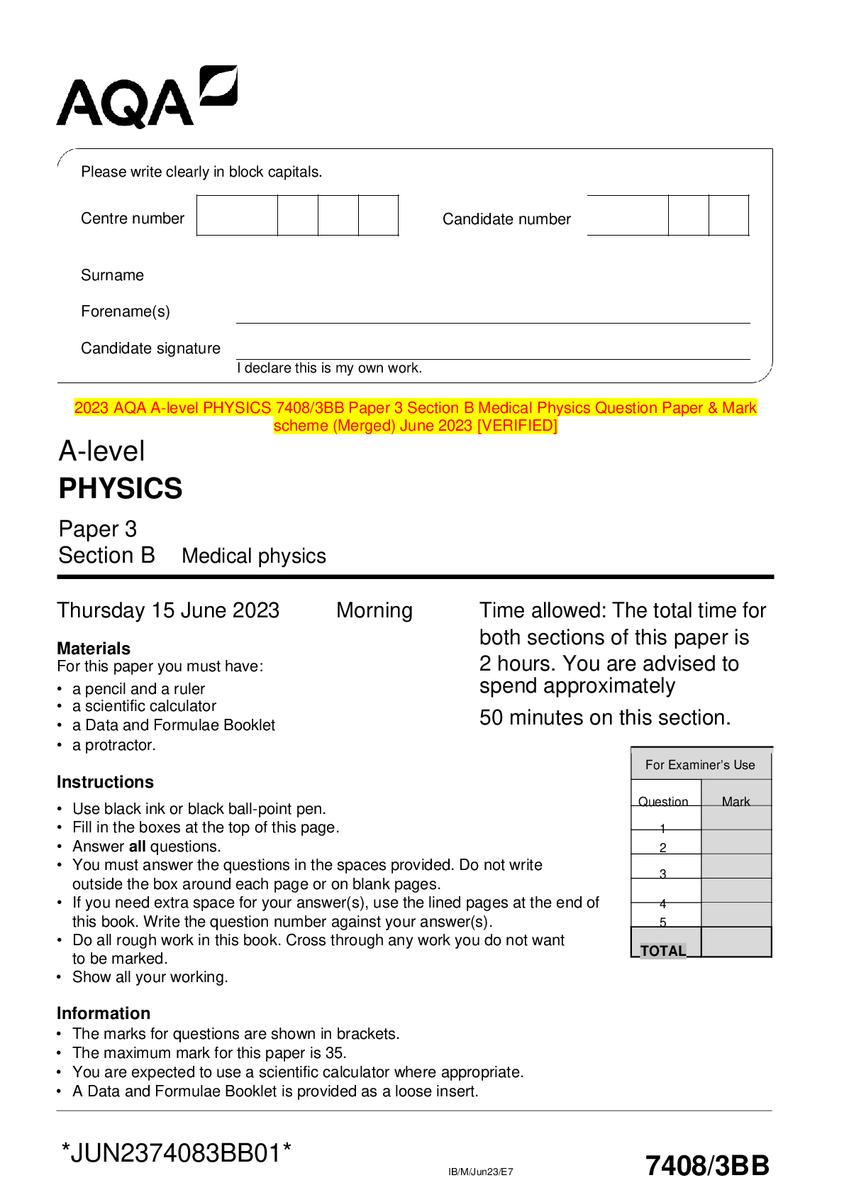 AQA > AQA QUESTION and MARK SCHEMES > 2023 AQA A-level PHYSICS 7408/3BB Paper 3 Section B Medical Physics Question Paper & Mark scheme (Merged) June 2023 [VERIFIED] (All)