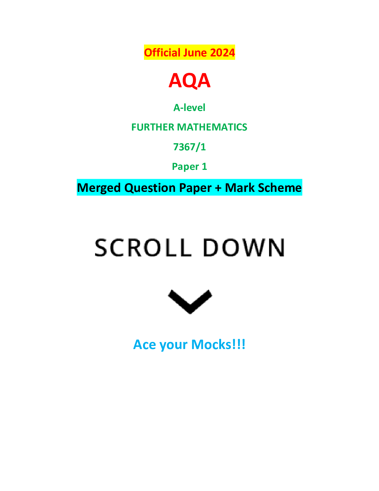 AQA > AQA > Official June 2024 AQA A-level FURTHER MATHEMATICS 7367/1 Paper 1 Merged Question Paper + Mark Scheme (All)