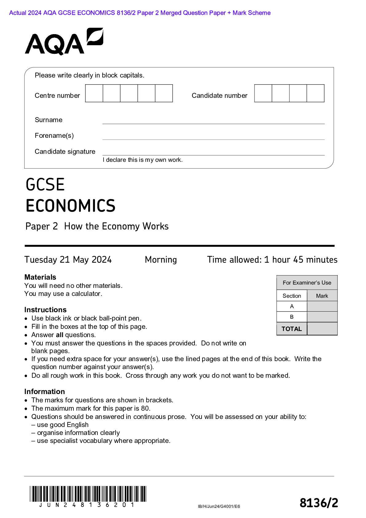 AQA > AQA > Actual 2024 AQA GCSE ECONOMICS 8136/2 Paper 2 Merged Question Paper + Mark Scheme Actual 2024 AQA GCSE ECONOMICS 8136/2 Paper 2 How the Economy Works Merged Question Paper + Mark Scheme (All)