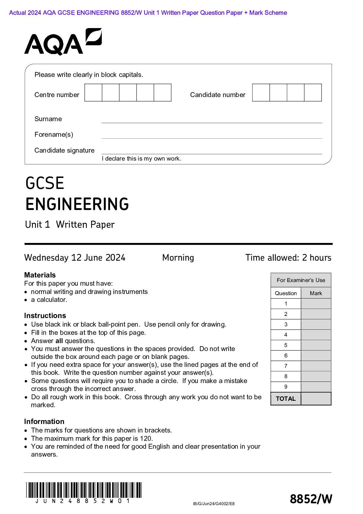 AQA > AQA > Actual 2024 AQA GCSE ENGINEERING 8852/W Unit 1 Written Paper Question Paper + Mark Scheme Actual 2024 AQA GCSE ENGINEERING 8852/W Unit 1 Written Paper Merged Question Paper + Mark Scheme (All)