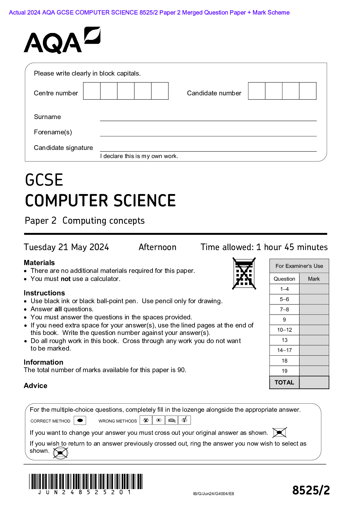 AQA > AQA > Actual 2024 AQA GCSE COMPUTER SCIENCE 8525/2 Paper 2 Merged Question Paper + Mark Scheme Actual 2024 AQA GCSE COMPUTER SCIENCE 8525/2 Paper 2 Computing concepts Merged Question Paper + Mark Scheme (All)