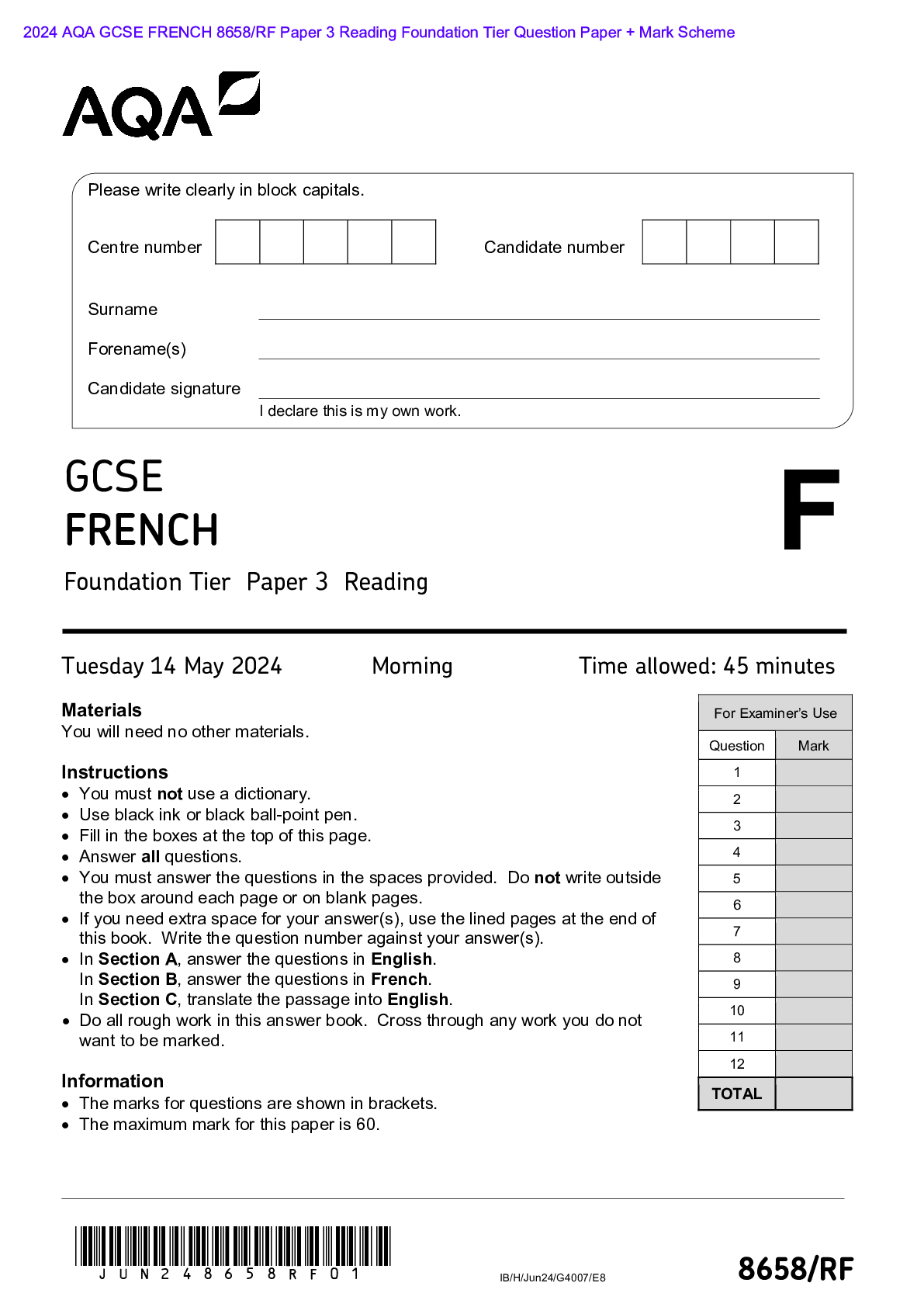 AQA > AQA > 2024 AQA GCSE FRENCH 8658/RF Paper 3 Reading Foundation Tier Question Paper + Mark Scheme Actual 2024 AQA GCSE FRENCH 8658/RF Paper 3 Reading Foundation Tier Merged Question Paper + Mark Scheme (All)