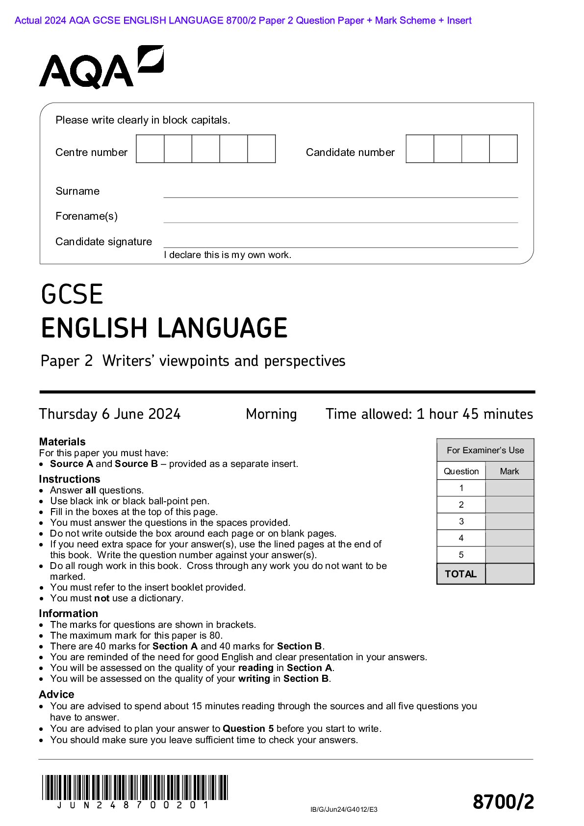 AQA > AQA > Actual 2024 AQA GCSE ENGLISH LANGUAGE 8700/2 Paper 2 Question Paper + Mark Scheme + Insert Actual 2024 AQA GCSE ENGLISH LANGUAGE 8700/2 Paper 2 Writers’ viewpoints and perspectives Merged Question Paper + Mark Scheme + Insert (All)