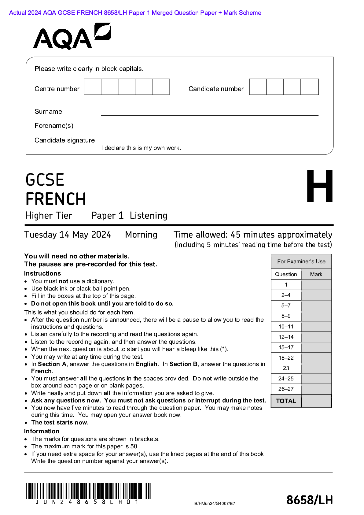 AQA > AQA > Actual 2024 AQA GCSE FRENCH 8658/LH Paper 1 Merged Question Paper + Mark Scheme Actual 2024 AQA GCSE FRENCH 8658/LH Paper 1 Listening Higher Tier Merged Question Paper + Mark Scheme (with Listening Test Transcript) (All)