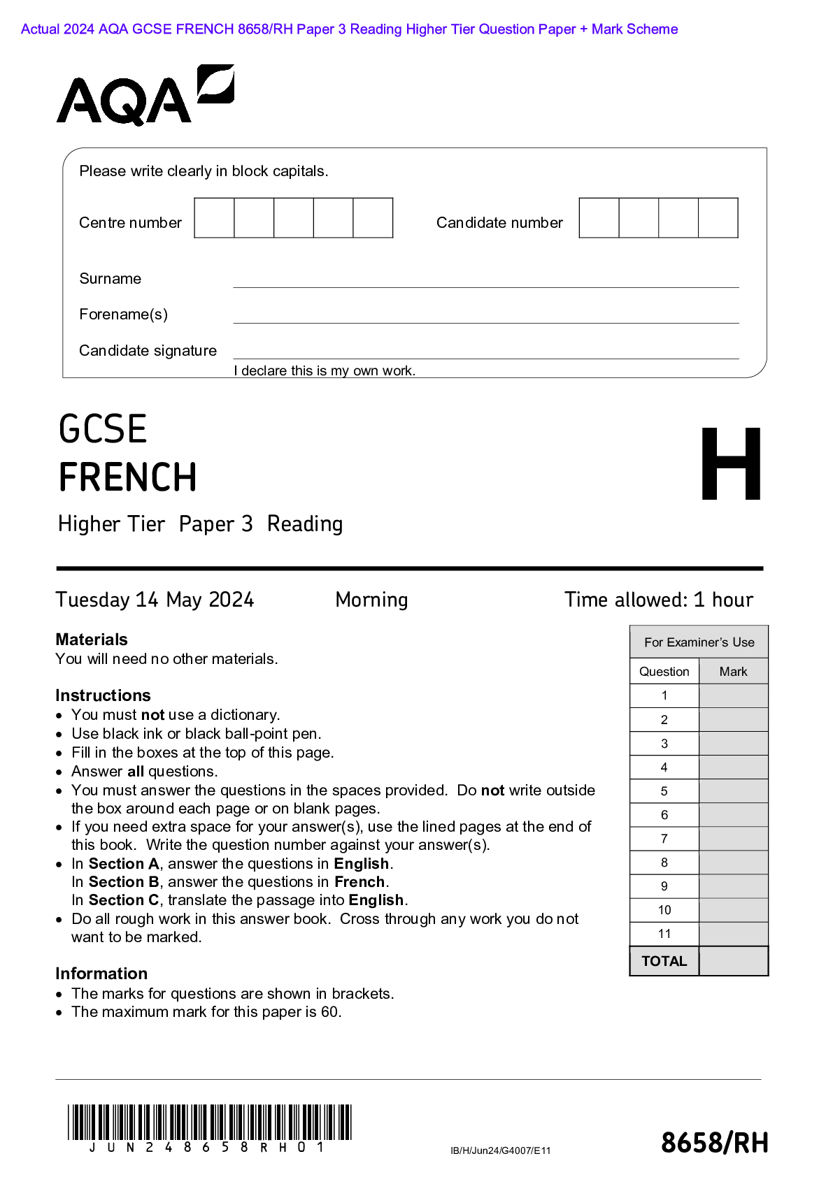 AQA > AQA > Actual 2024 AQA GCSE FRENCH 8658/RH Paper 3 Reading Higher Tier Question Paper + Mark Scheme Actual 2024 AQA GCSE FRENCH 8658/RH Paper 3 Reading Higher Tier Merged Question Paper + Mark Scheme (All)