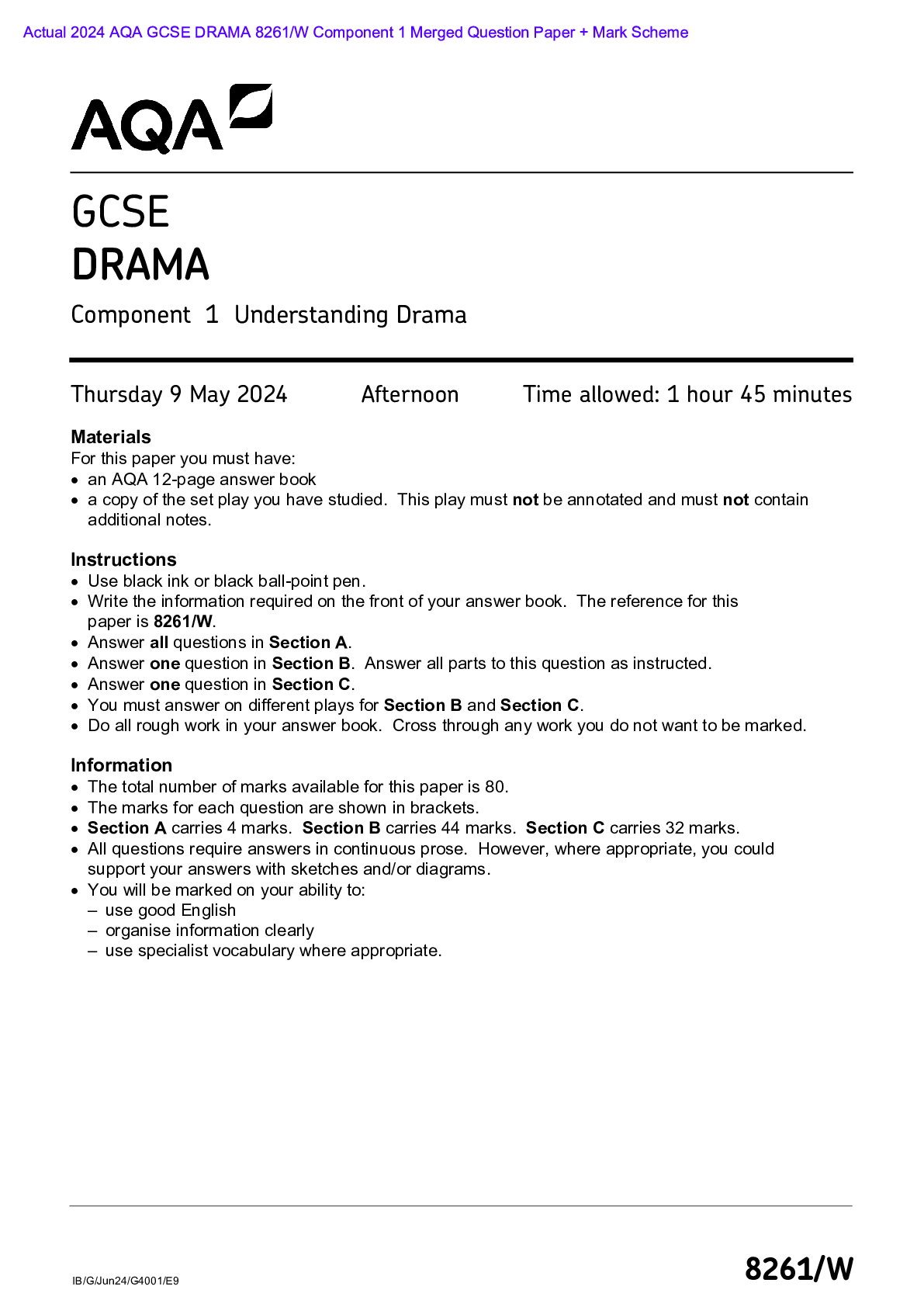 AQA > AQA > Actual 2024 AQA GCSE DRAMA 8261/W Component 1 Merged Question Paper + Mark Scheme Actual 2024 AQA GCSE DRAMA 8261/W Component 1 Understanding Drama Merged Question Paper + Mark Scheme (All)