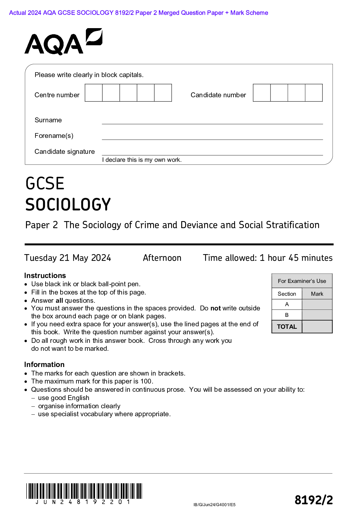 AQA > AQA > Actual 2024 AQA GCSE SOCIOLOGY 8192/2 Paper 2 Merged Question Paper + Mark Scheme Actual 2024 AQA GCSE SOCIOLOGY 8192/2 Paper 2 The Sociology of Crime and Deviance and Social Stratification Merged Question Paper + Mark Scheme (All)