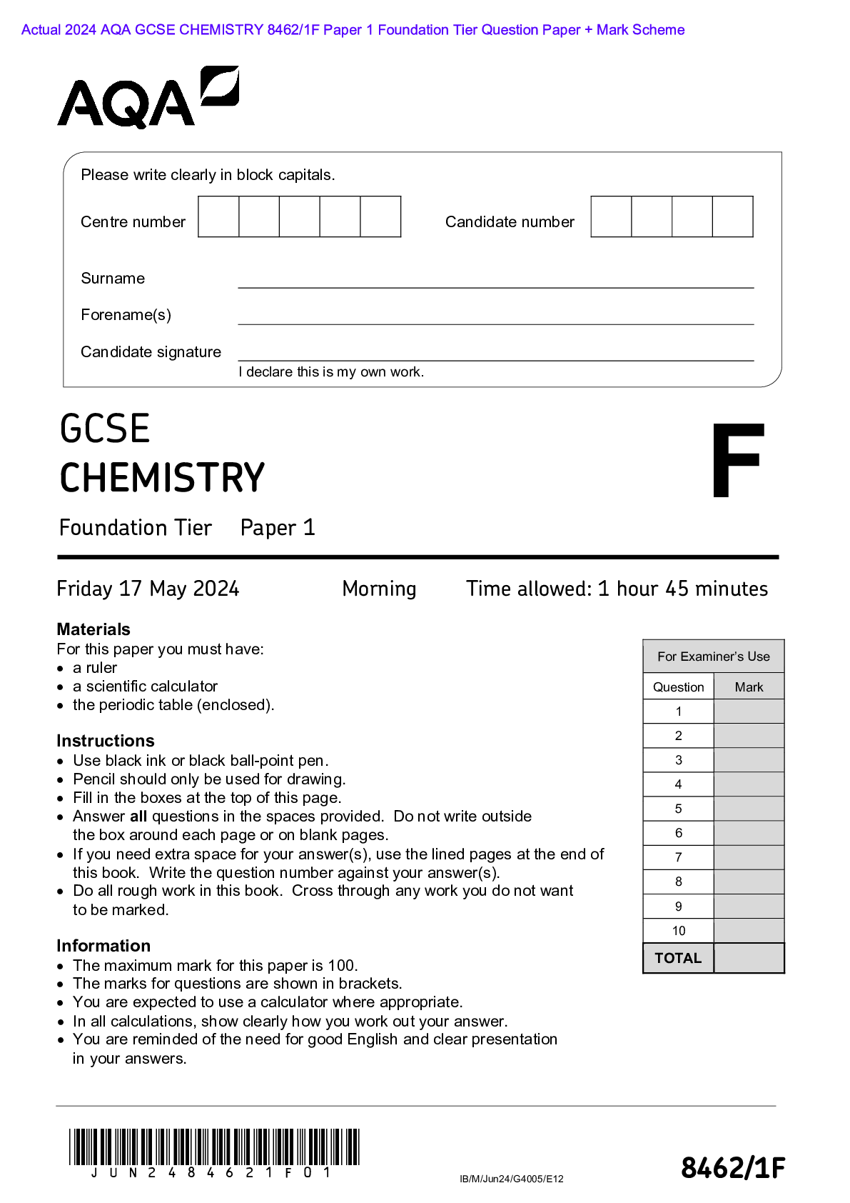 AQA > AQA > Actual 2024 AQA GCSE CHEMISTRY 8462/1F Paper 1 Foundation Tier Question Paper + Mark Scheme Actual 2024 AQA GCSE CHEMISTRY 8462/1F Paper 1 Foundation Tier Merged Question Paper + Mark Scheme (All)