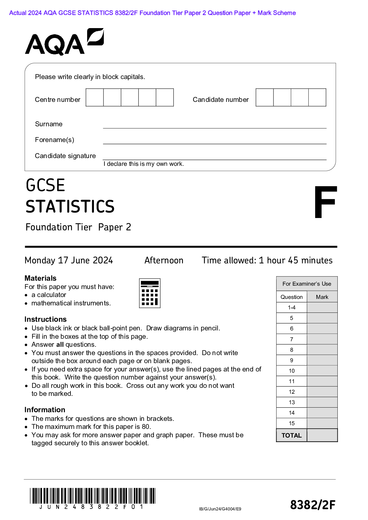 AQA > AQA > Actual 2024 AQA GCSE STATISTICS 8382/1F Foundation Tier Paper 1 Question Paper + Mark Scheme Actual 2024 AQA GCSE STATISTICS 8382/1F Foundation Tier Paper 1 Merged Question Paper + Mark Scheme (All)