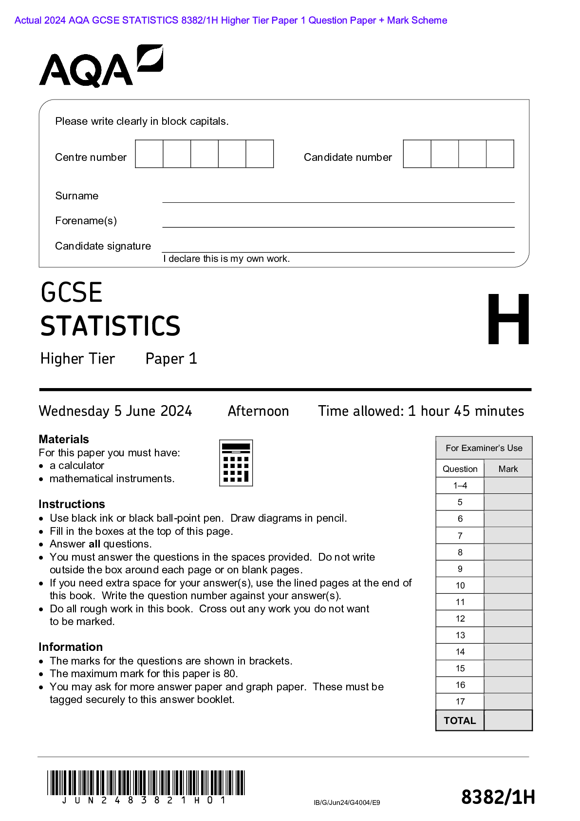 AQA > AQA > Actual 2024 AQA GCSE STATISTICS 8382/1H Higher Tier Paper 1 Question Paper + Mark Scheme Actual 2024 AQA GCSE STATISTICS 8382/1H Higher Tier Paper 1 Merged Question Paper + Mark Scheme (All)