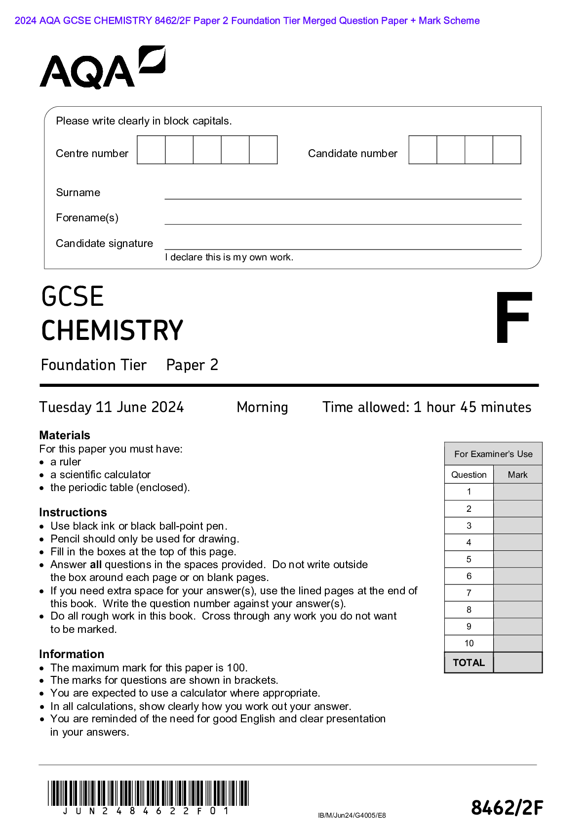 AQA > AQA > 2024 AQA GCSE CHEMISTRY 8462/2F Paper 2 Foundation Tier Merged Question Paper + Mark Scheme Actual 2024 AQA GCSE CHEMISTRY 8462/2F Paper 2 Foundation Tier Merged Question Paper + Mark Scheme (All)