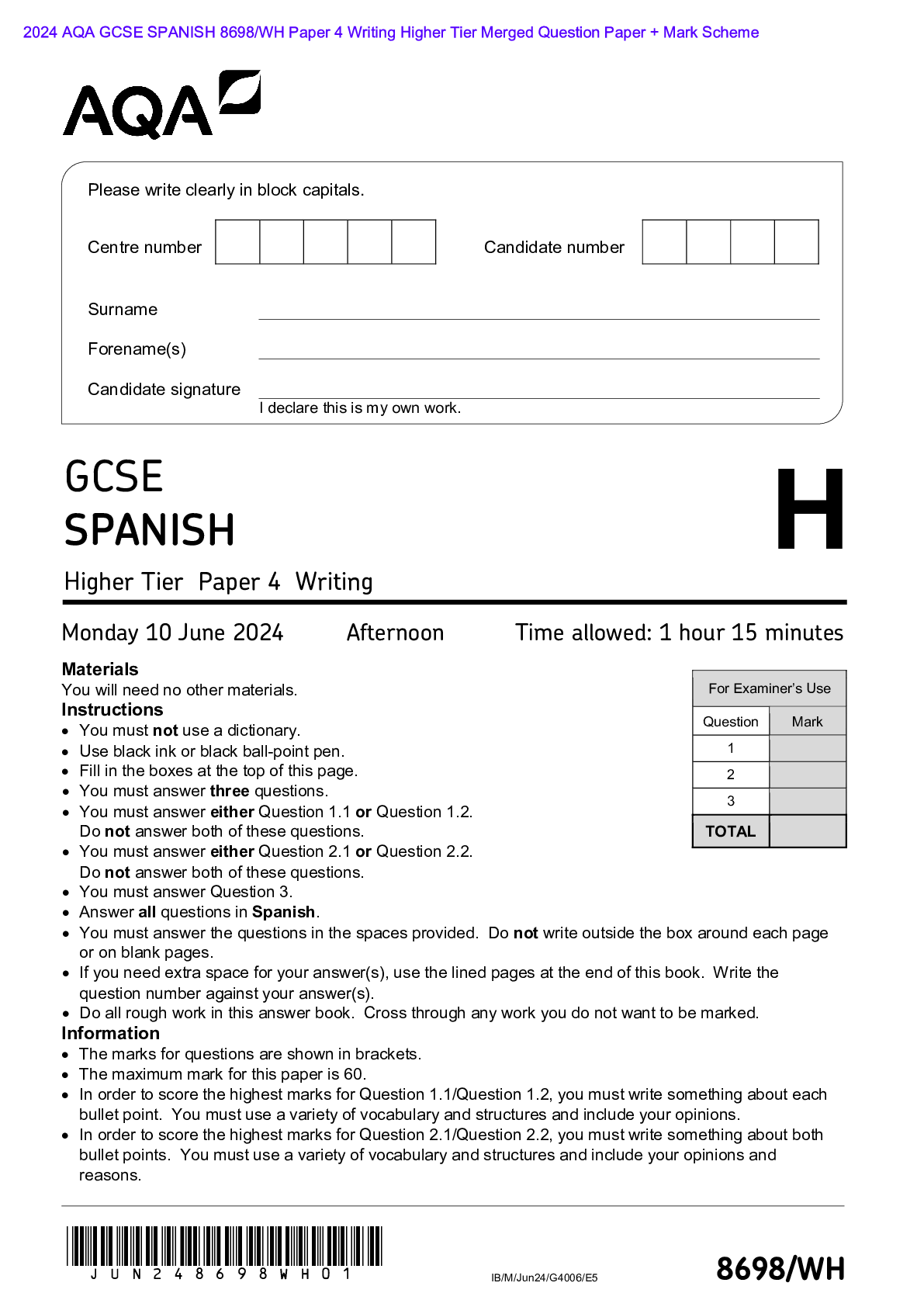 AQA > AQA > 2024 AQA GCSE SPANISH 8698/WH Paper 4 Writing Higher Tier Merged Question Paper + Mark Scheme Actual 2024 AQA GCSE SPANISH 8698/WH Paper 4 Writing Higher Tier Merged Question Paper + Mark Scheme (All)