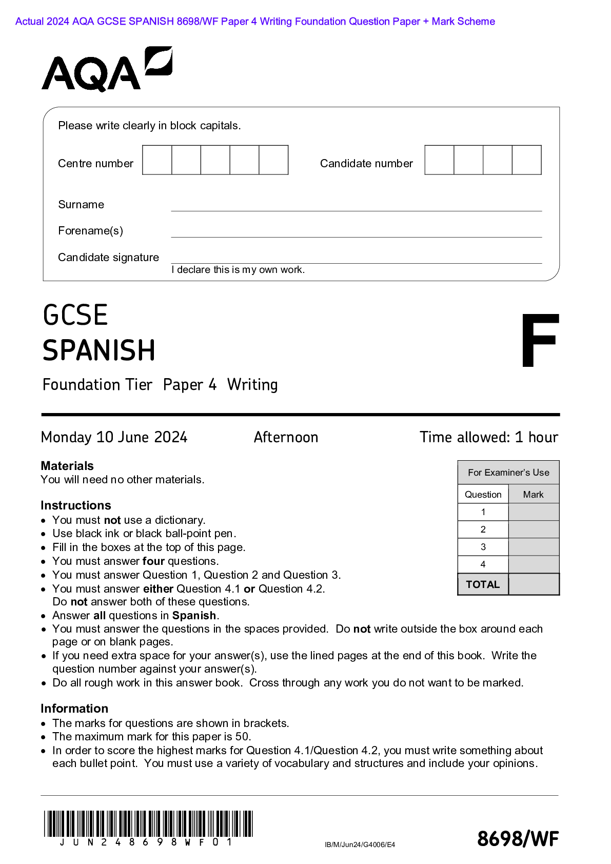 AQA > AQA > Actual 2024 AQA GCSE SPANISH 8698/WF Paper 4 Writing Foundation Question Paper + Mark Scheme Actual 2024 AQA GCSE SPANISH 8698/WF Paper 4 Writing Foundation Tier Merged Question Paper + Mark Scheme (All)