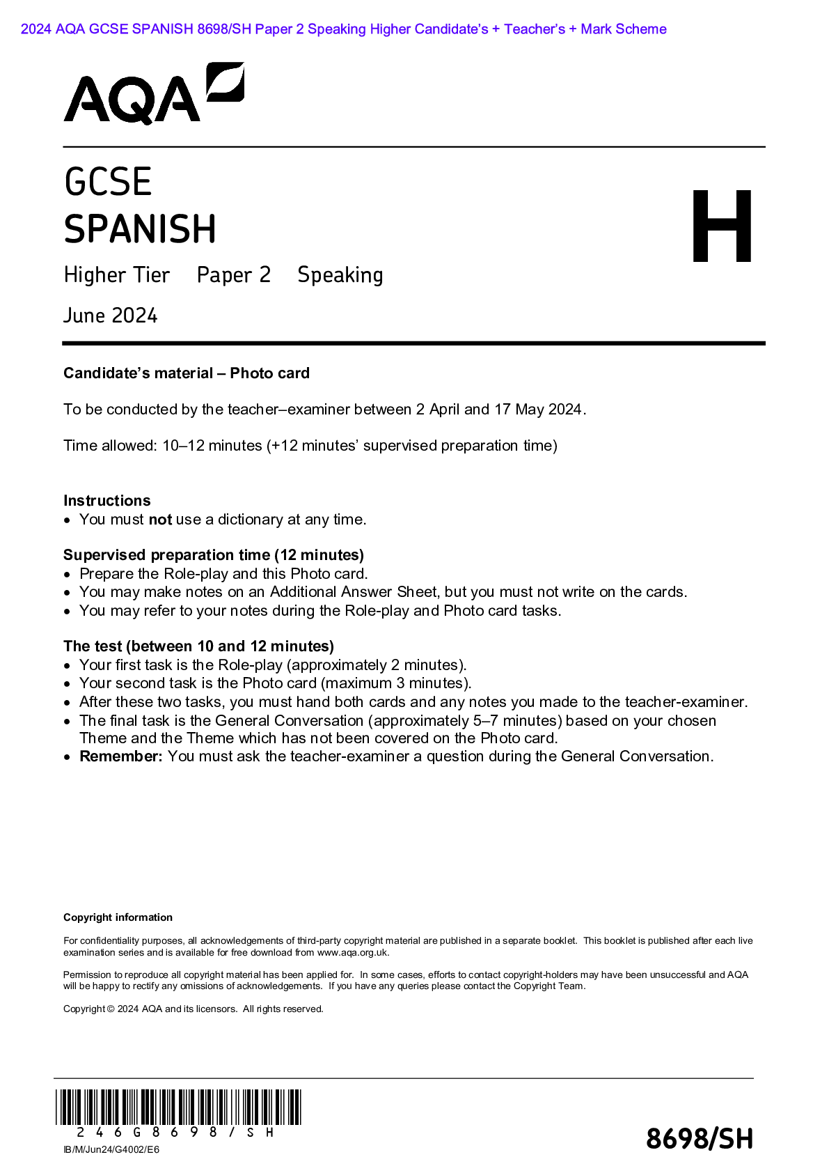 AQA > AQA > 2024 AQA GCSE SPANISH 8698/SH Paper 2 Speaking Higher Candidate’s + Teacher’s + Mark Scheme Actual 2024 AQA GCSE SPANISH 8698/SH Paper 2 Speaking Higher Merged Candidate’s material – Photo card & Roleplay + Teacher’s Booklet + Mark Scheme (including Guidance for Role-plays) (All)