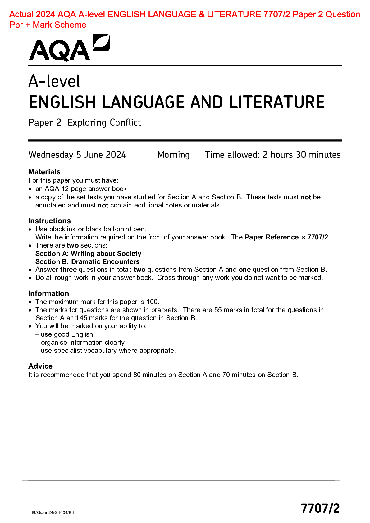 AQA > AQA > Actual 2024 AQA A-level ENGLISH LANGUAGE & LITERATURE 7707/2 Paper 2 Question Ppr + Mark Scheme Actual 2024 AQA A-level ENGLISH LANGUAGE AND LITERATURE 7707/2 Paper 2 Exploring Conflict Merged Question Paper + Mark Scheme (All)