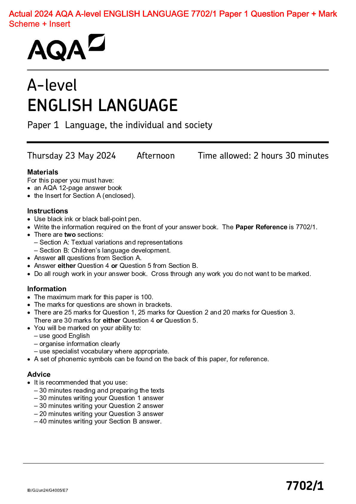 AQA > AQA > Actual 2024 AQA A-level ENGLISH LANGUAGE 7702/1 Paper 1 Question Paper + Mark Scheme + Insert Actual 2024 AQA A-level ENGLISH LANGUAGE 7702/1 Paper 1 Language, the individual and society Merged Question Paper + Mark Scheme + Insert (All)
