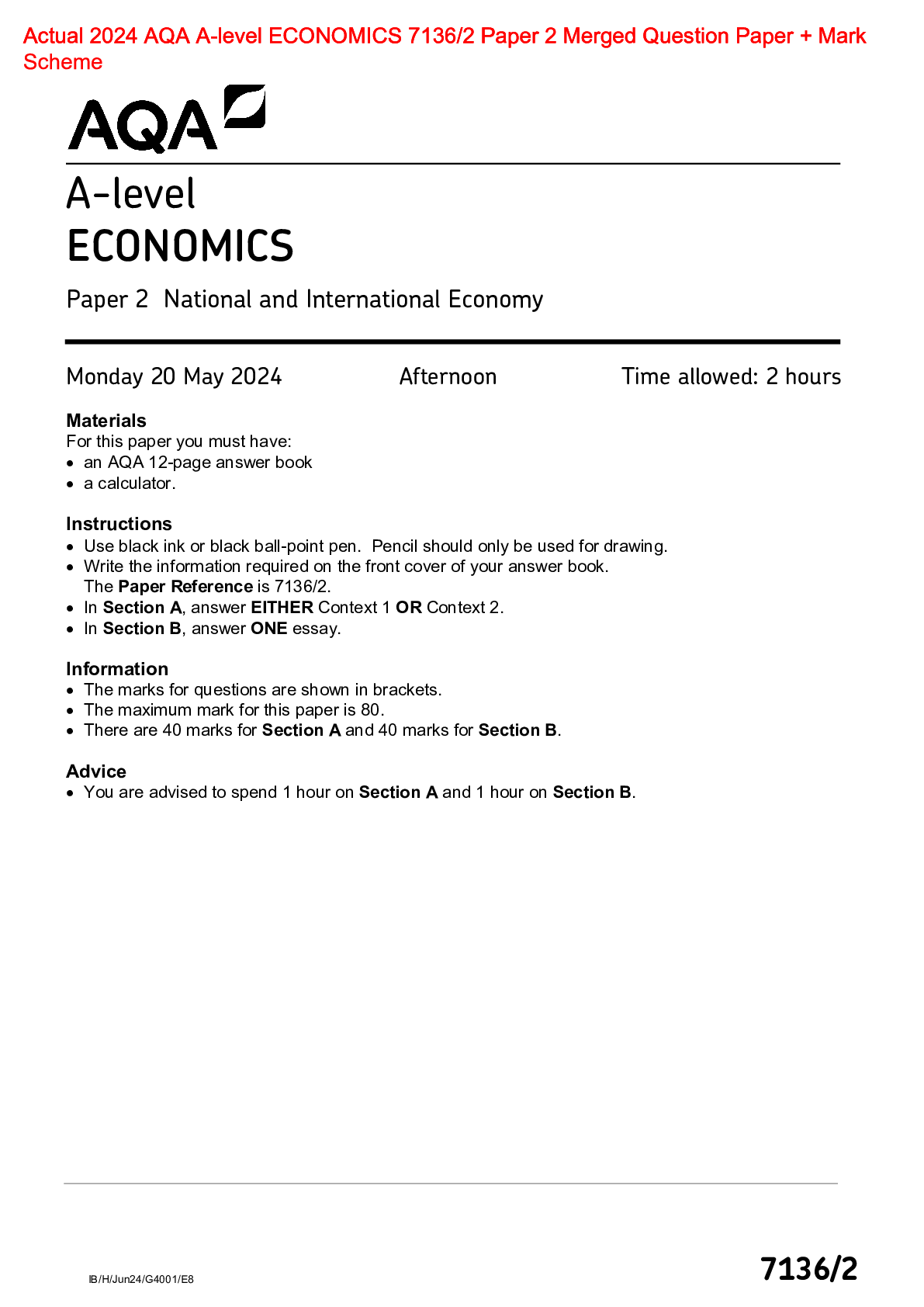 AQA > AQA > Actual 2024 AQA A-level ECONOMICS 7136/2 Paper 2 Merged Question Paper + Mark Scheme Actual 2024 AQA A-level ECONOMICS 7136/2 Paper 2 National and International Economy Merged Question Paper + Mark Scheme (All)