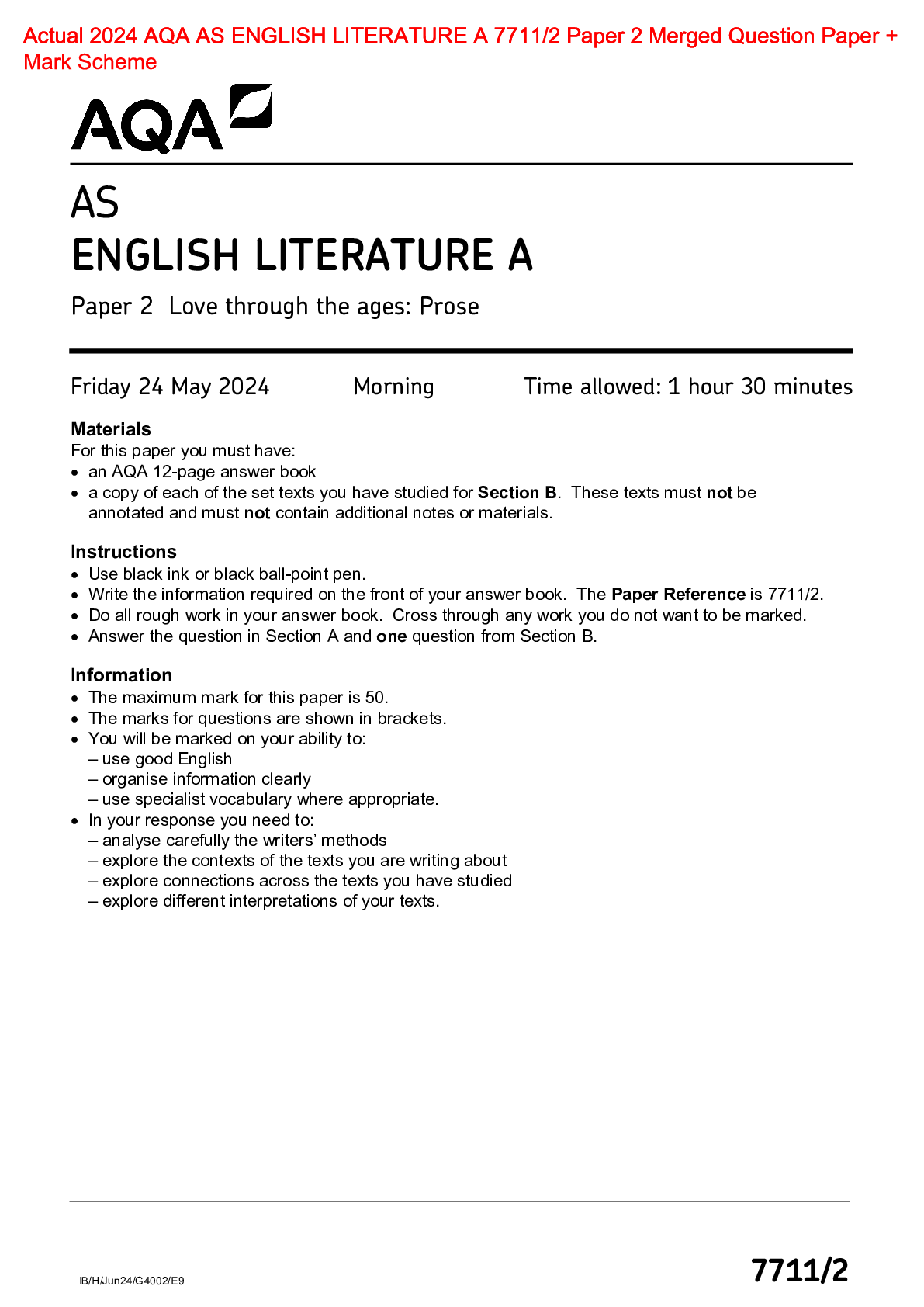 AQA > AQA > Actual 2024 AQA AS ENGLISH LITERATURE A 7711/2 Paper 2 Merged Question Paper + Mark Scheme Actual 2024 AQA AS ENGLISH LITERATURE A 7711/2 Paper 2 Love through the ages: Prose Merged Question Paper + Mark Scheme (All)