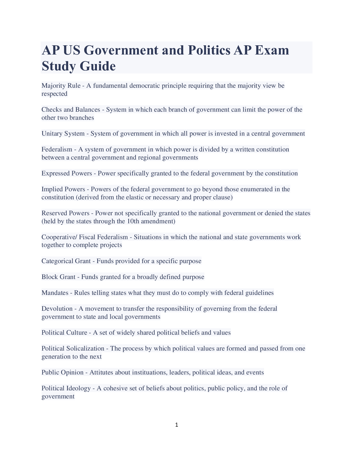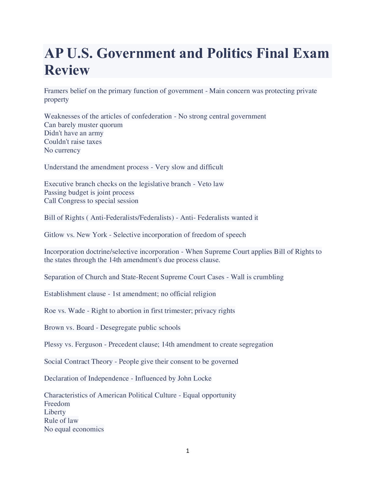 Political Science > EXAM > AP U.S. Government and Politics Final Exam Review Recent (All)