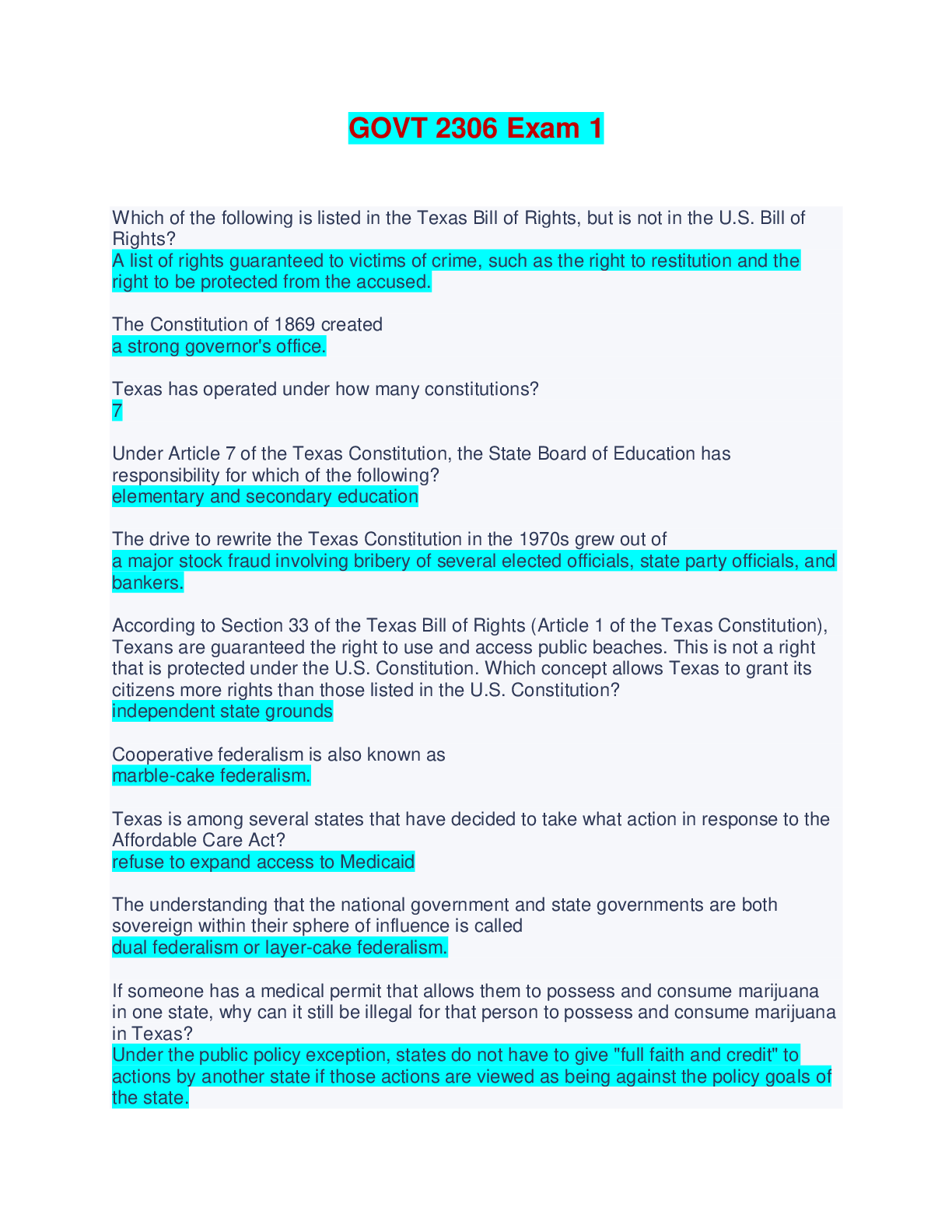 Political Science > EXAM > GOVT 2306 Exam 1 - Questions and Answers (All)