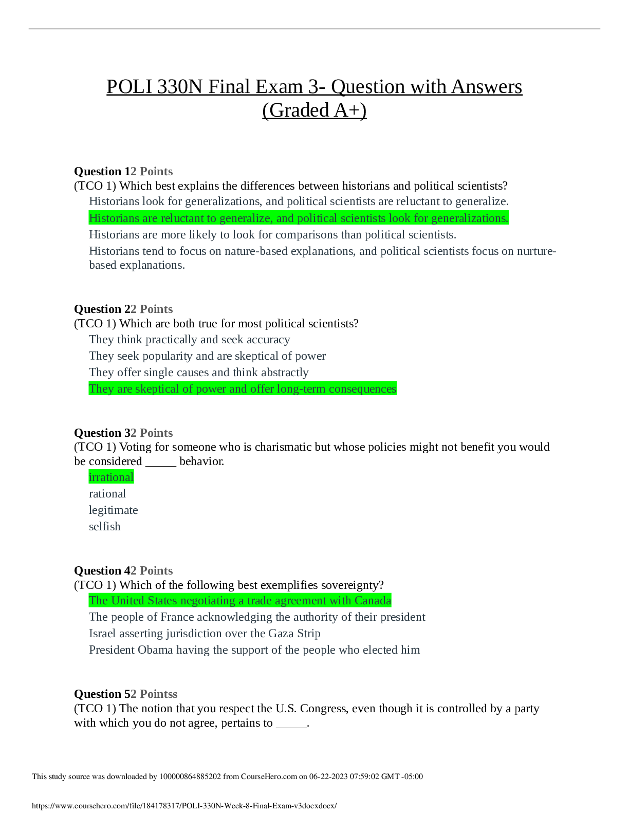 Political Science > EXAM > POLI 330N Final Exam 3- Question with Answers(Graded A+) (All)
