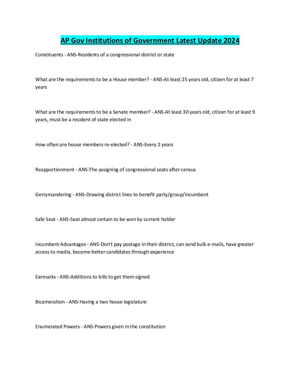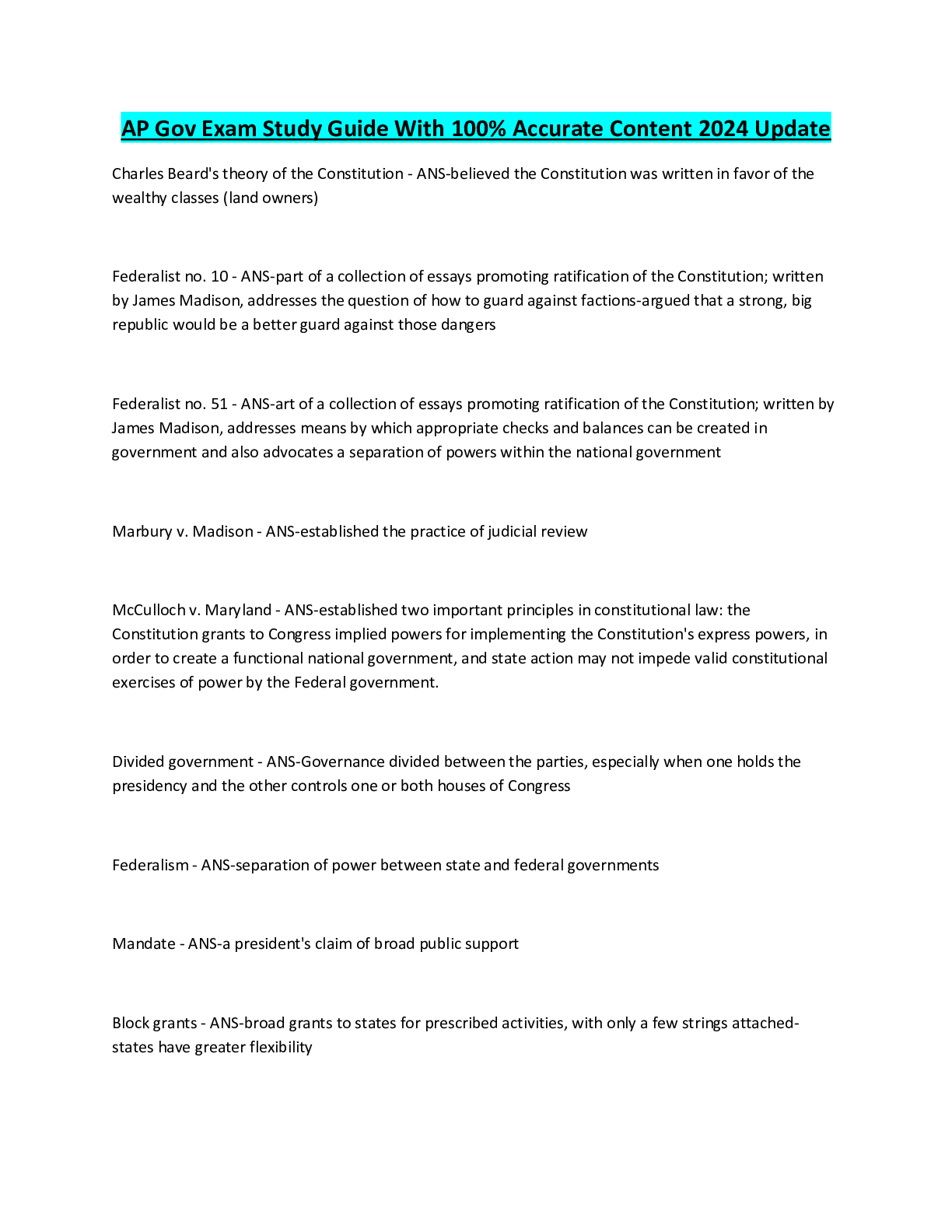 Political Science > EXAM > AP Gov Exam Study Guide With 100% Accurate Content 2024 Update (All)