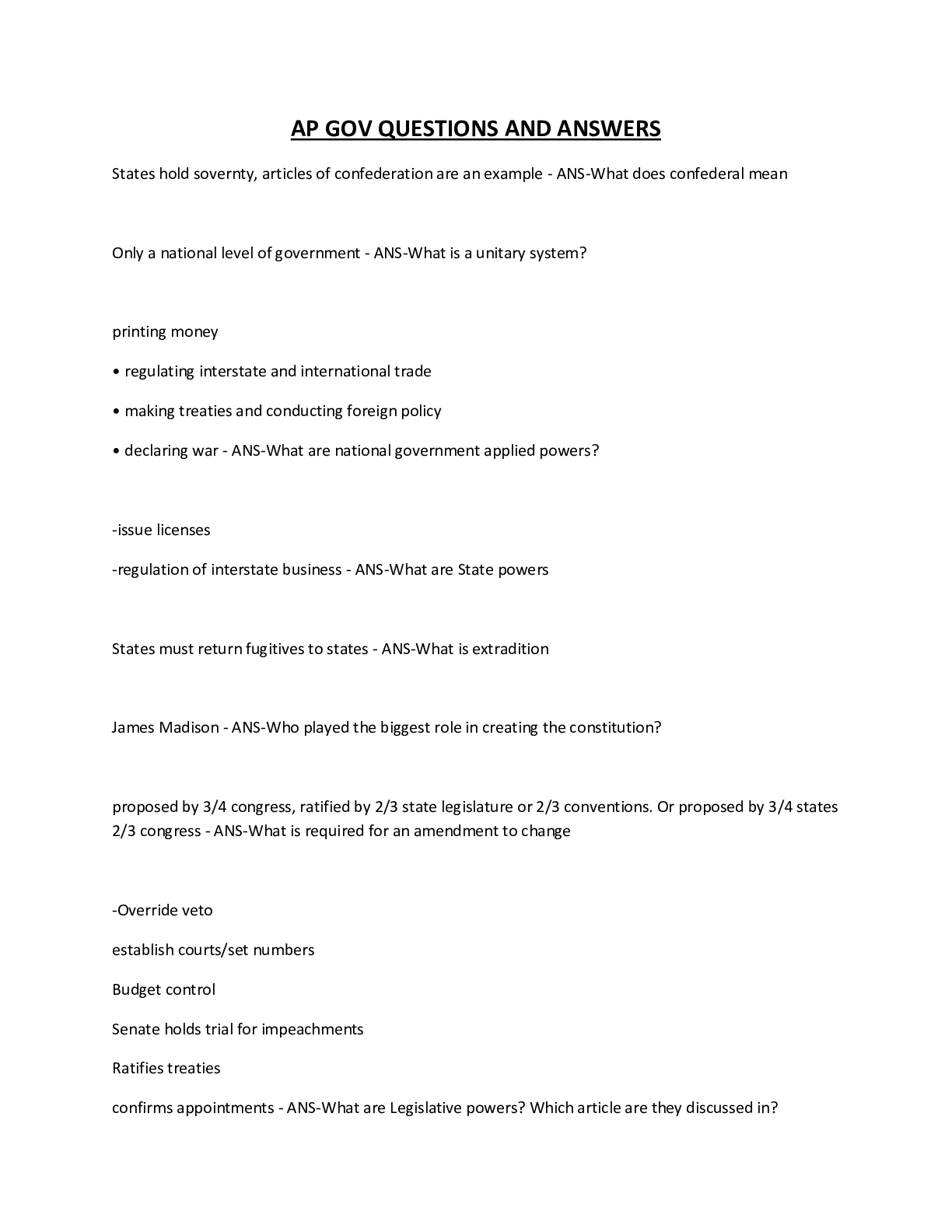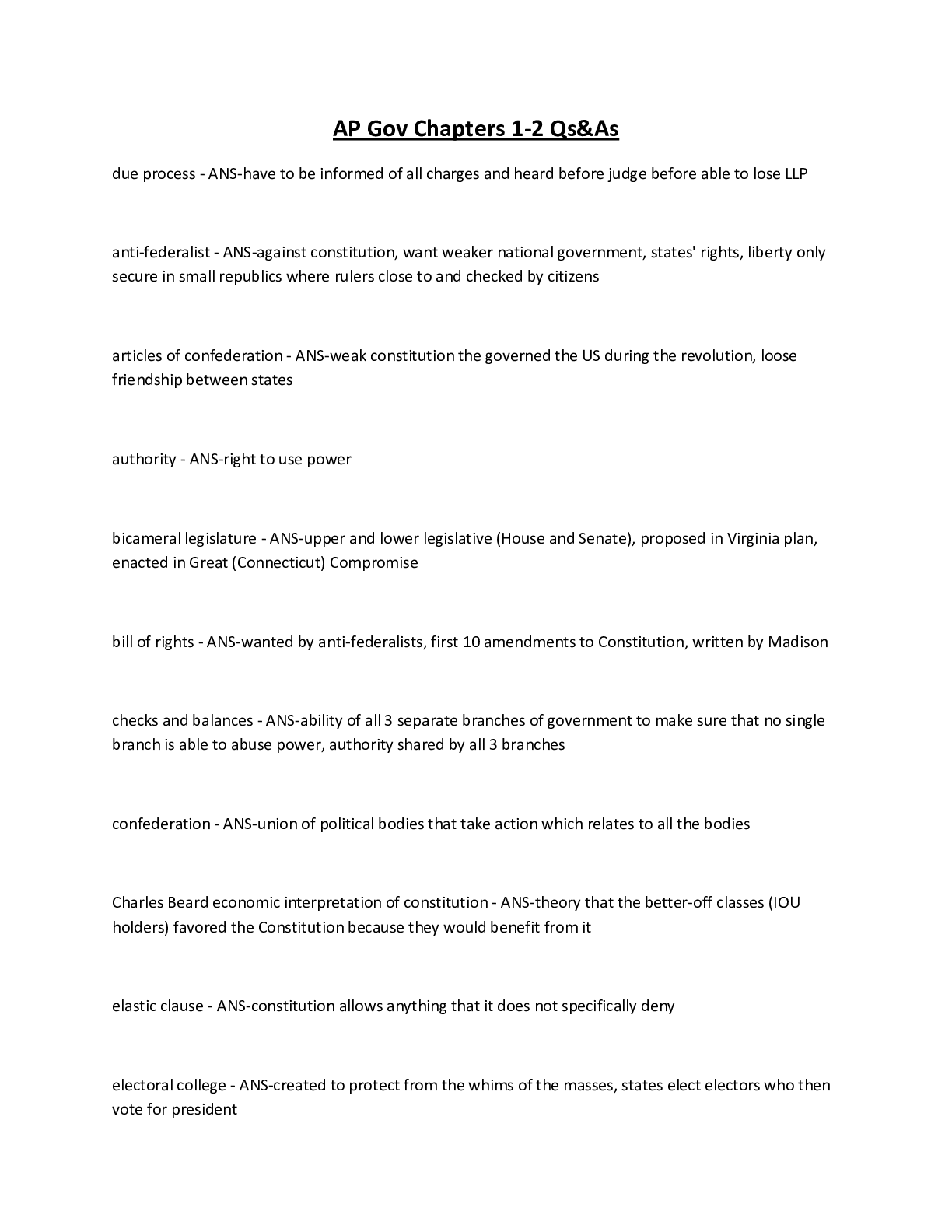 Political Science > EXAM > AP Government and Politics · CH1: Foundations of American democracy · CH2: Interactions among branches of government Qs&As (All)