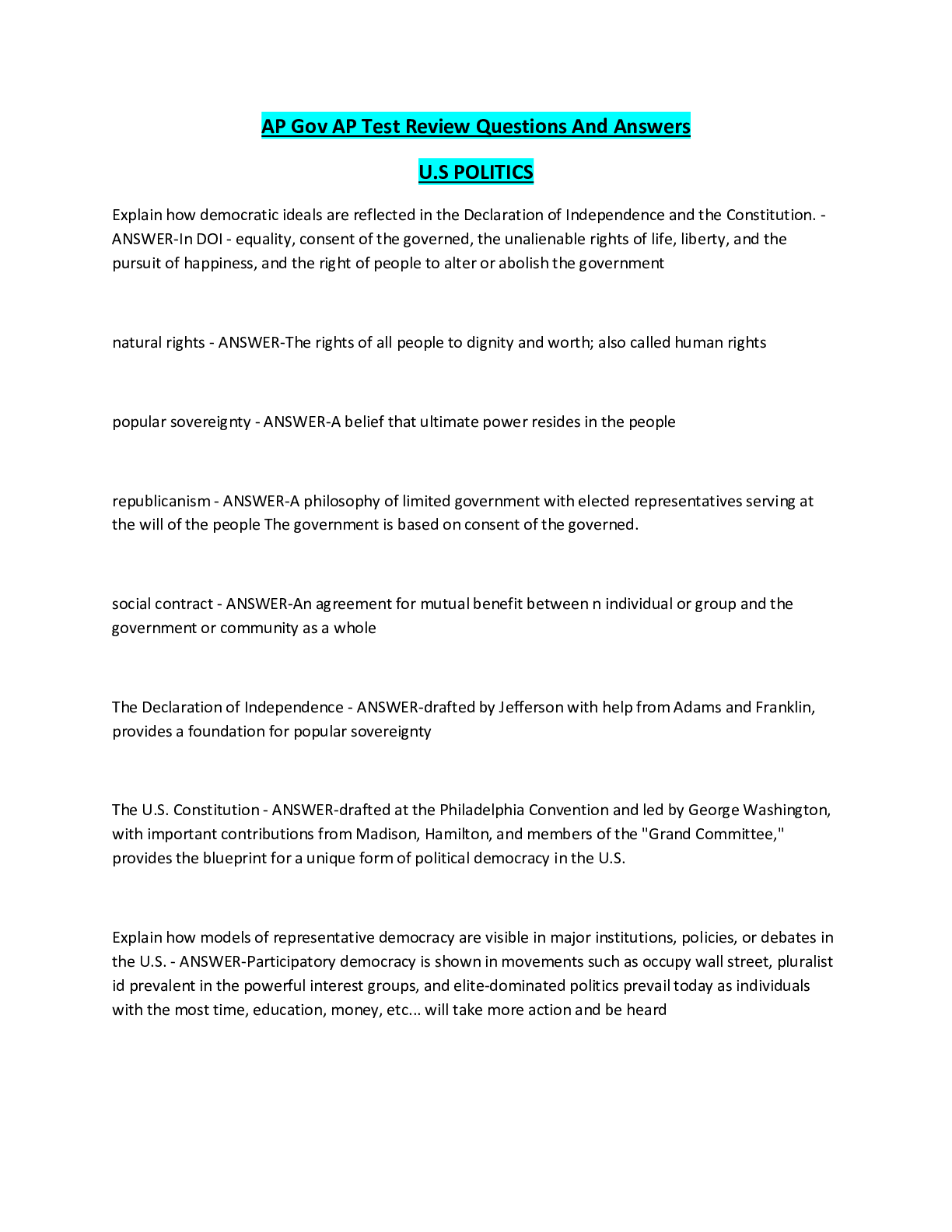 Political Science > EXAM > AP Gov AP Test Review Questions And Answers U.S POLITICS (All)
