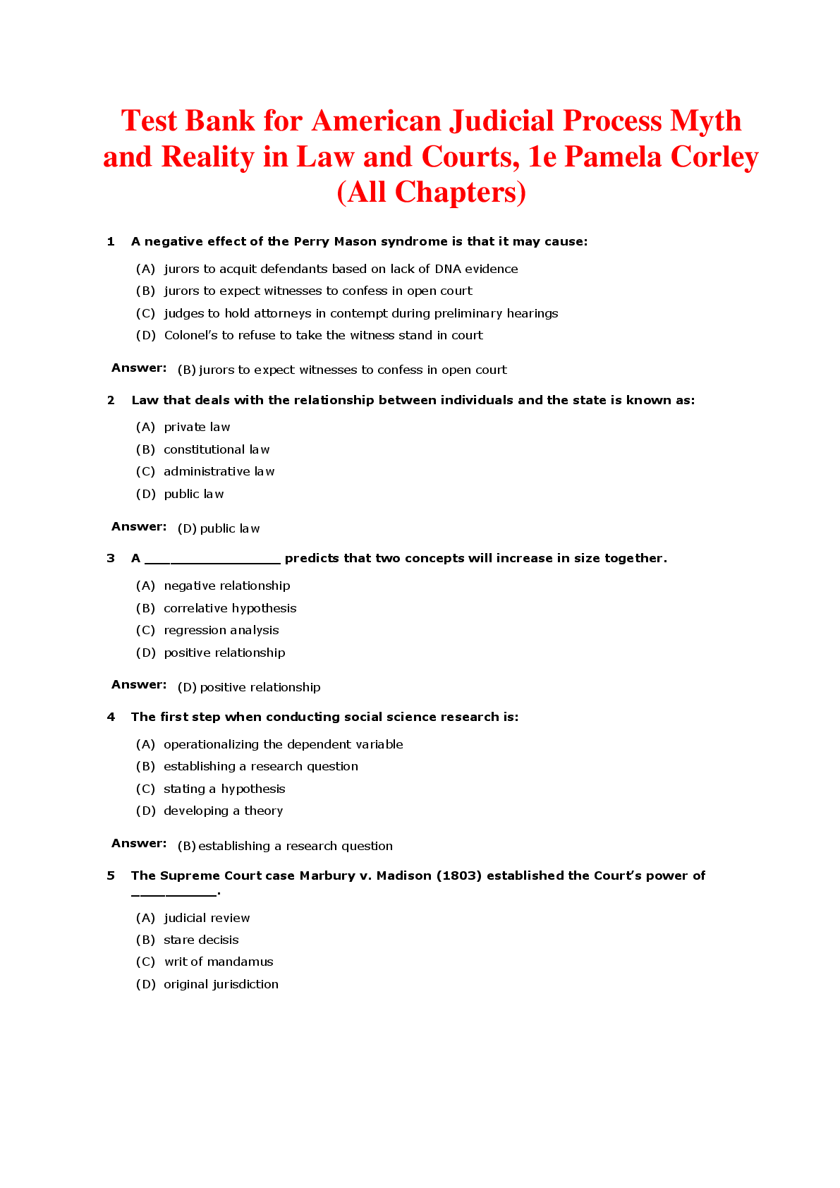 Political Science > TEST BANKS > Test Bank for American Judicial Process Myth and Reality in Law and Courts, 1e Pamela Corley (All)