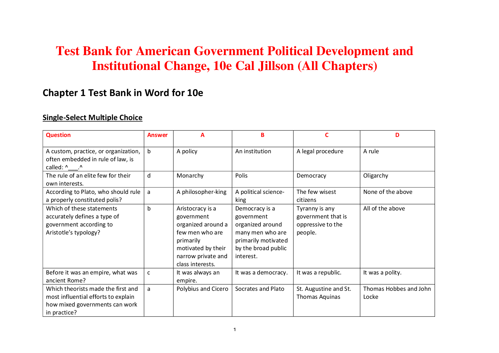 Political Science > TEST BANKS > Test Bank for American Government Political Development and Institutional Change, 10e Cal Jillson (All)