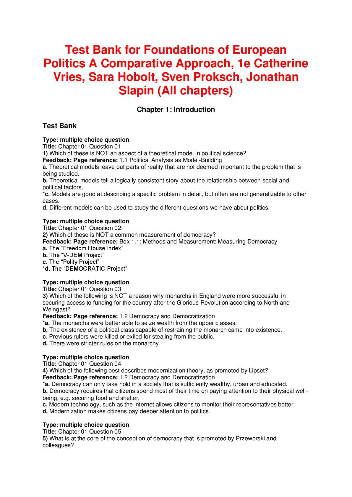 Political Science > TEST BANKS > Test Bank for Foundations of European Politics A Comparative Approach, 1st Edition By Catherine Vries, Sara Hobolt, Sven Proksch, Jonathan Slapin (All)