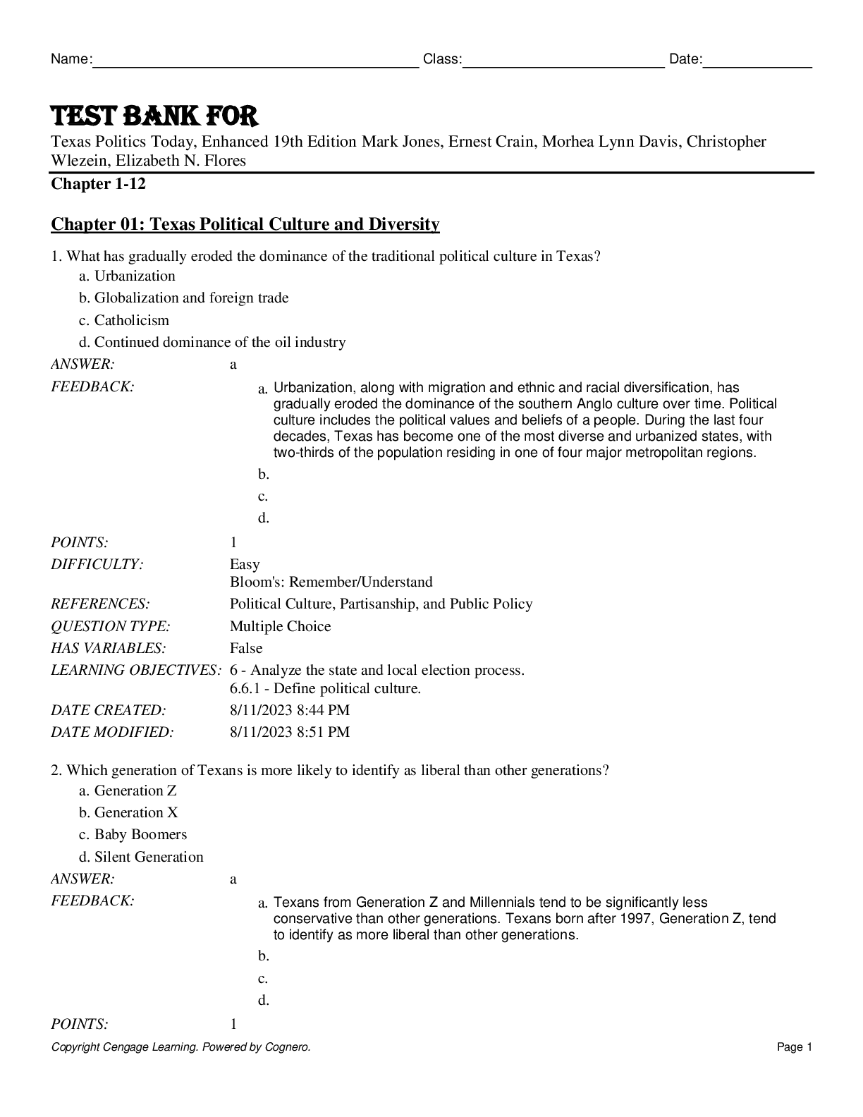 Political Science > TEST BANKS > Test Bank For Texas Politics Today, Enhanced 19th Edition by Mark Jones, Ernest Crain, Morhea Lynn Davis, Christopher Wlezein, Elizabeth N. Flores Chapter 1-12 (All)