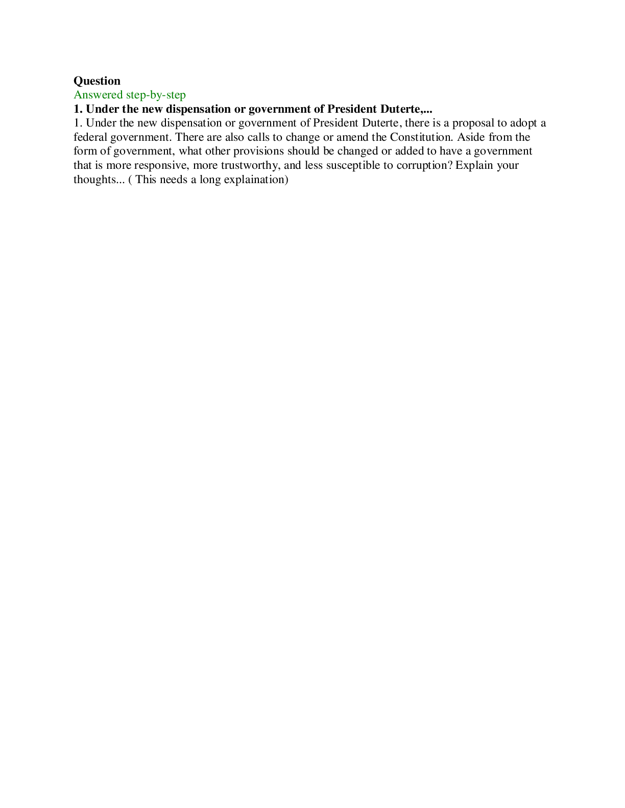 Political Science > QUESTIONS & ANSWERS > Under the new dispensation or government of President Duterte, there is a proposal to adopt a federal government. There are also calls to change or amend the Constitution. Aside from the form of government, what other provisions should be changed or added to have a government that is more responsive, more trustworthy, and less susceptible to corruption? Explain your thoughts (All)