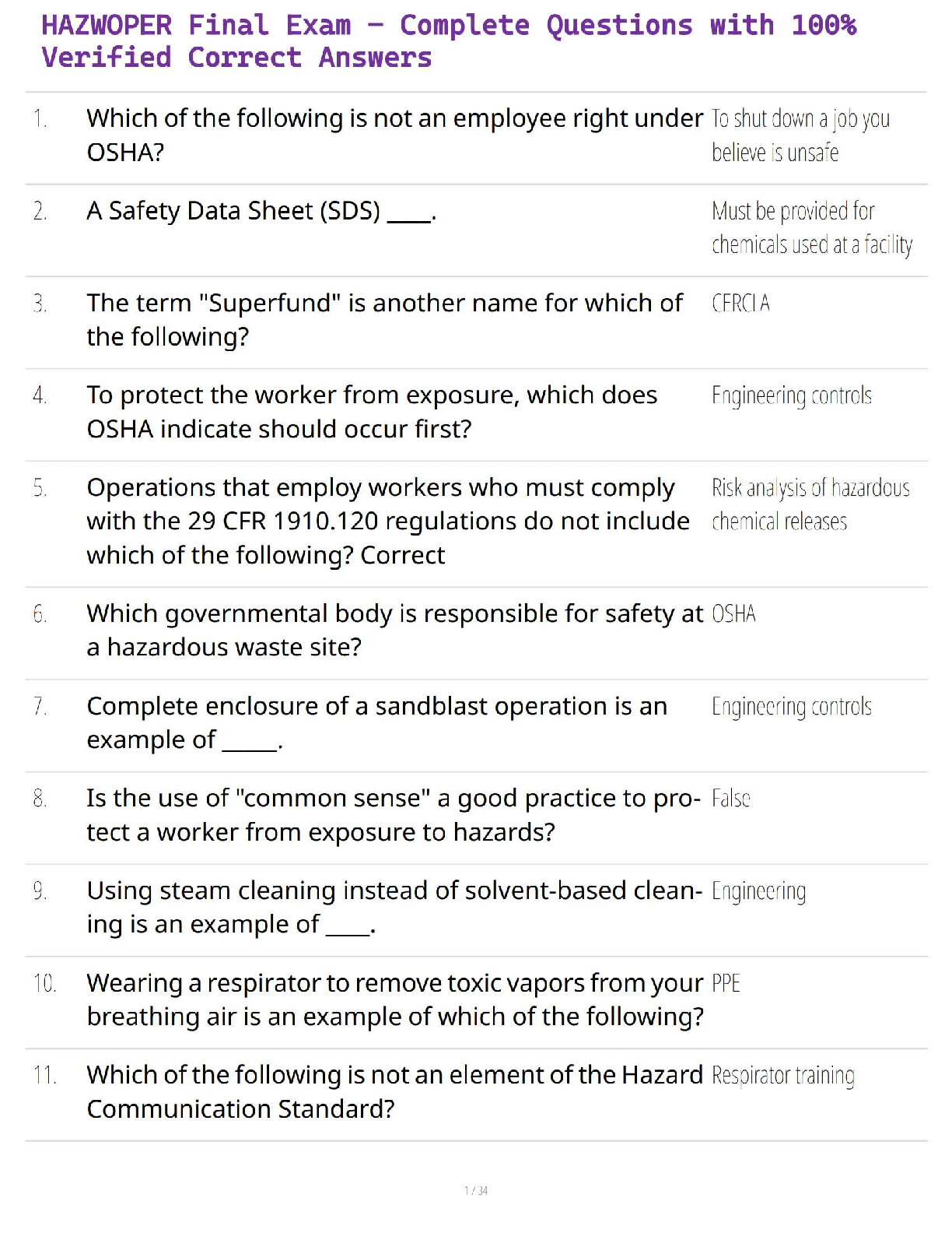 HAZWOPER > QUESTIONS and ANSWERS > HAZWOPER Final Exam – Complete Questions with 100% Verified Correct Answers (All)