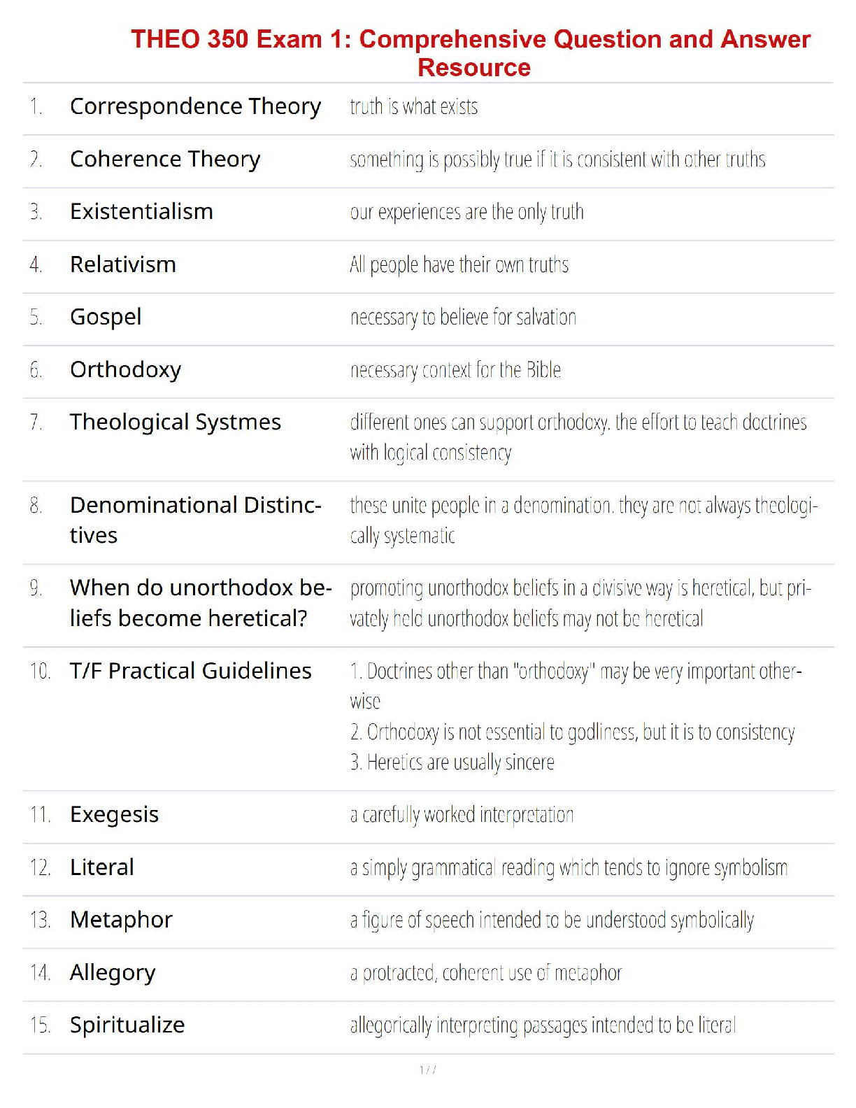 Religious Studies > EXAMs > THEO 350 Exam 1: Comprehensive Question and Answer Resource (All)