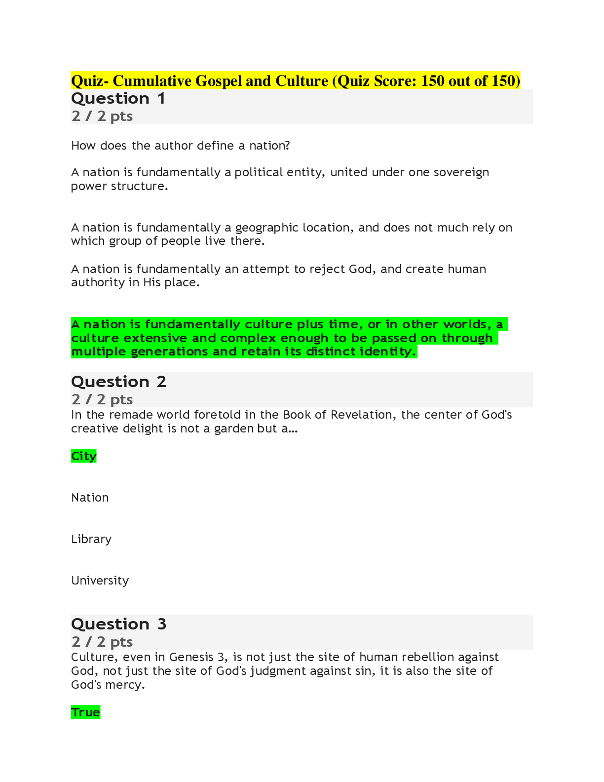 Religious Studies > EXAMs > Liberty University RLGN 210 | RLGN210 Exam - Cumulative Gospel and Culture, Answered 100% all correct. (All)