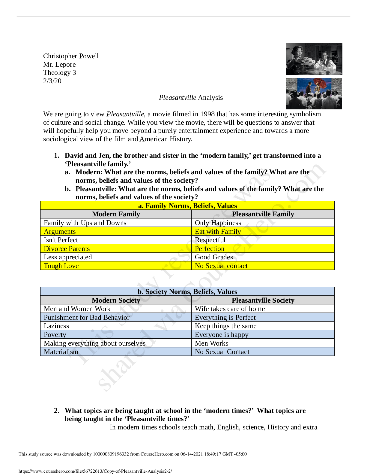 Religious Studies > STUDY GUIDE > Copy of Pleasantville_Analysis (All)