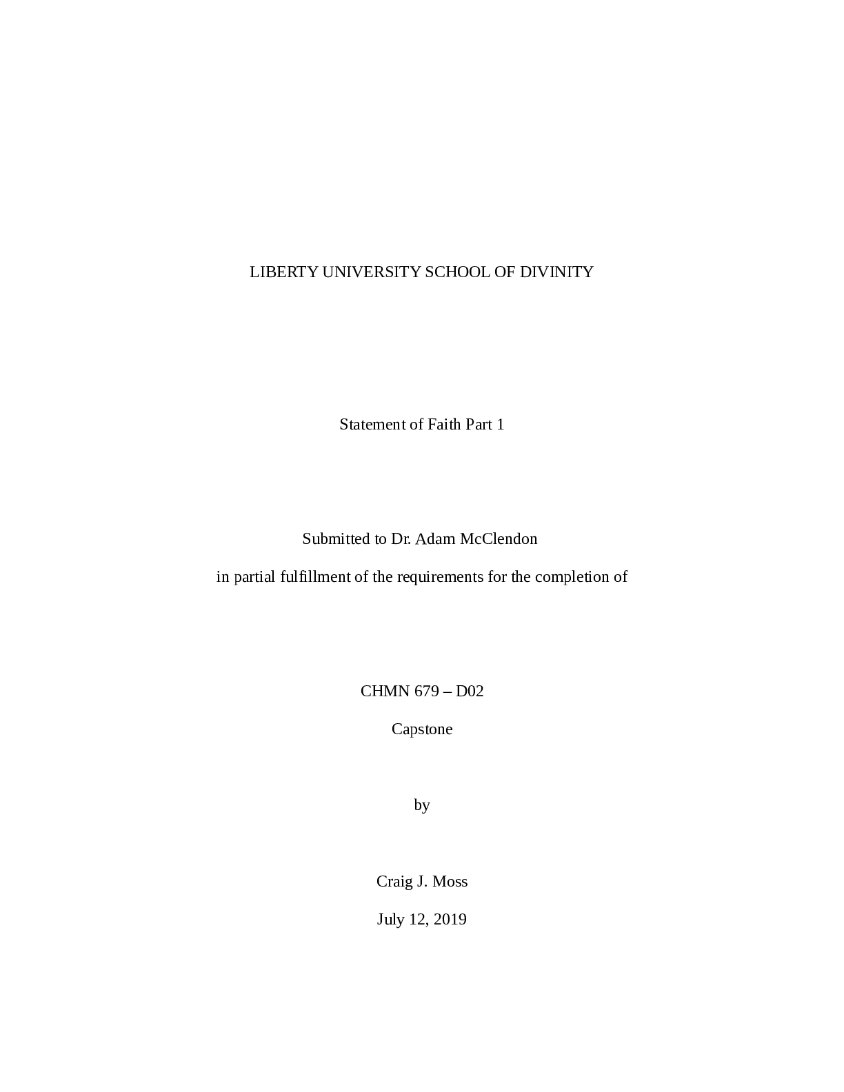 Religious Studies > ESSAY > LIBERTY UNIVERSITY SCHOOL OF DIVINITY - CHMN 679 Statement of Faith Part 1. Latest 2021/22 (All)