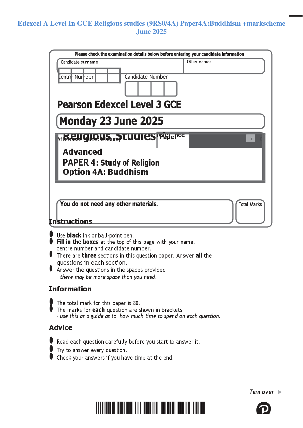 Religious Studies > Edexcel > Edexcel A Level In GCE Religious studies (9RS0/4A) Paper4A:Buddhism +markscheme June 2025 (All)