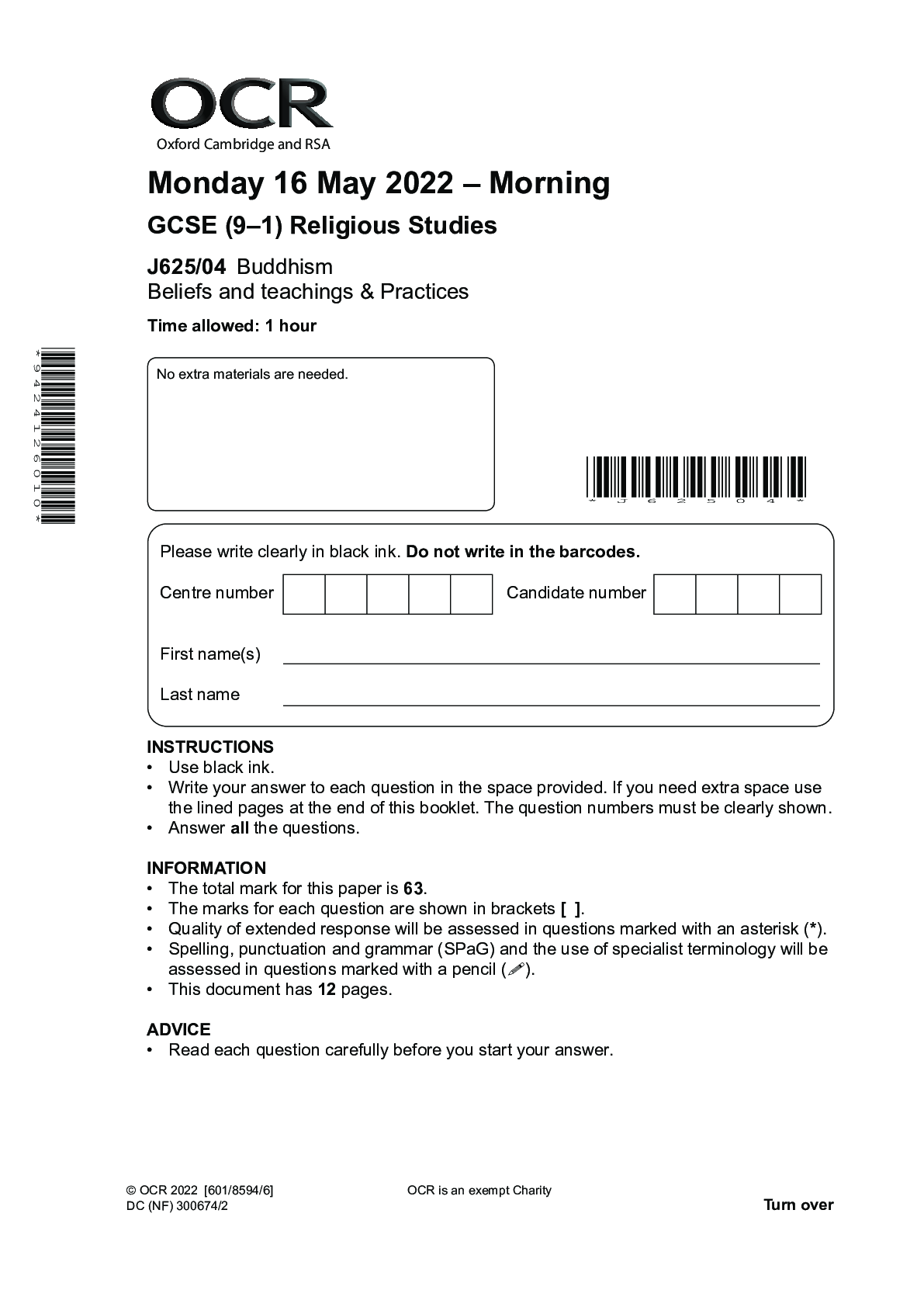 Religious Studies > QUESTION PAPER (QP) > OCR Oxford Cambridge and RSA Monday 16 May 2022 - Morning GCSE (9—1) Religious Studies J625/04 Buddhism Beliefs and teachings & Practices (All)