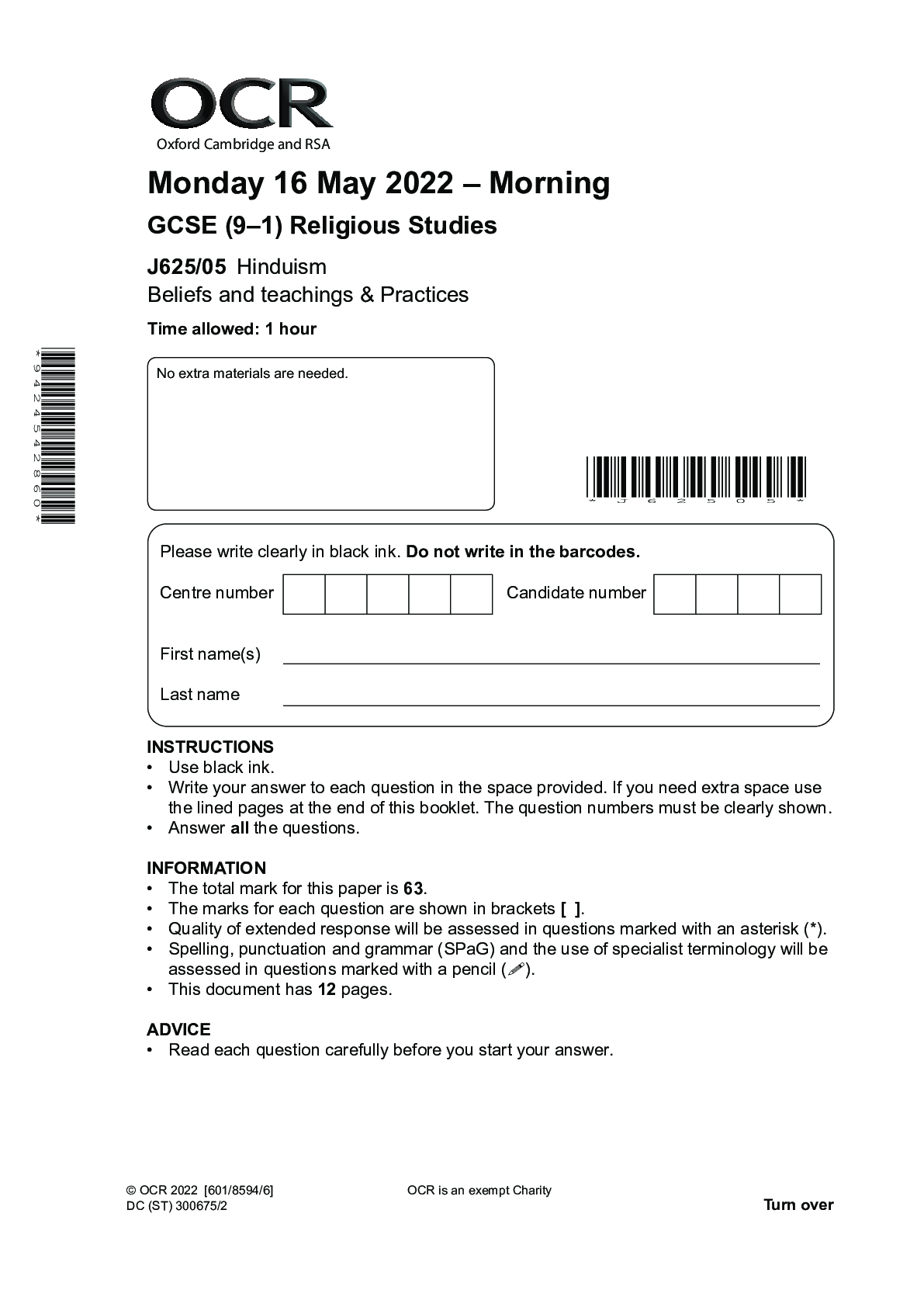Religious Studies > QUESTION PAPER (QP) > OCR Oxford Cambridge and RSA Monday 16 May 2022 - Morning GCSE (9—1) Religious Studies J625/05 Hinduism Beliefs and teachings & Practices (All)
