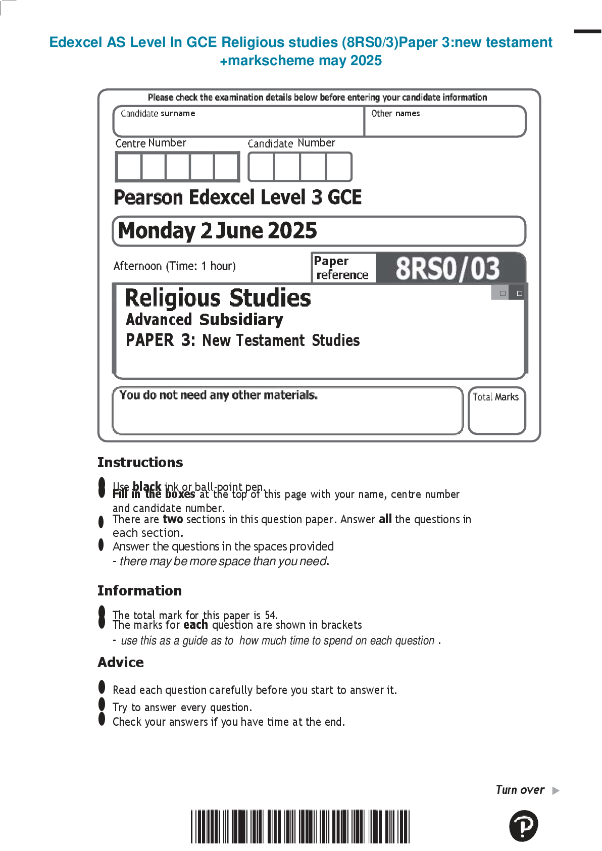 Religious Studies > Edexcel > Edexcel AS Level In GCE Religious studies (8RS0/3)Paper 3:new testament +markscheme may 2025 (All)