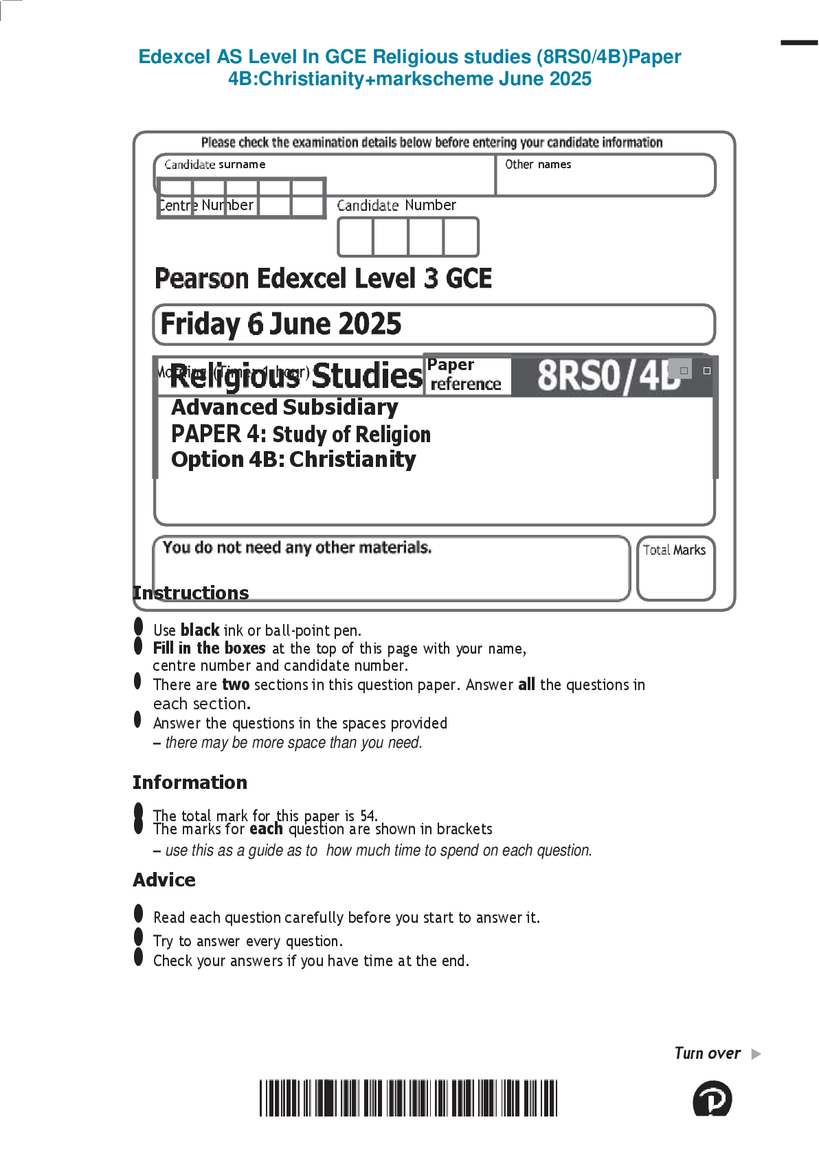 Religious Studies > Edexcel > Edexcel AS Level In GCE Religious studies (8RS0/4B)Paper 4B:Christianity+markscheme June 2025 (All)