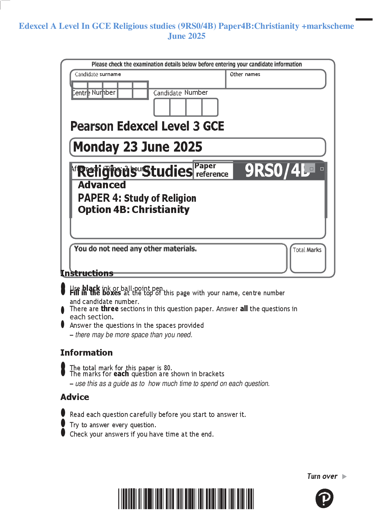 Religious Studies > Edexcel > Edexcel A Level In GCE Religious studies (9RS0/4B) Paper4B:Christianity +markscheme June 2025 (All)