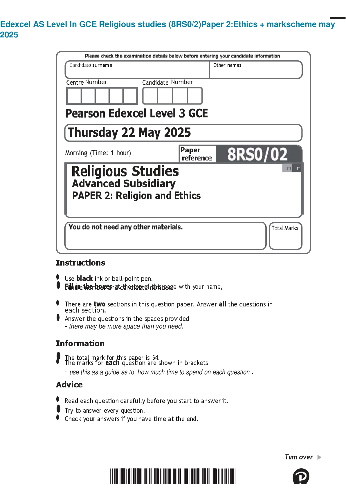 Religious Studies > Edexcel > Edexcel AS Level In GCE Religious studies (8RS0/2)Paper 2:Ethics + markscheme may 2025 (All)