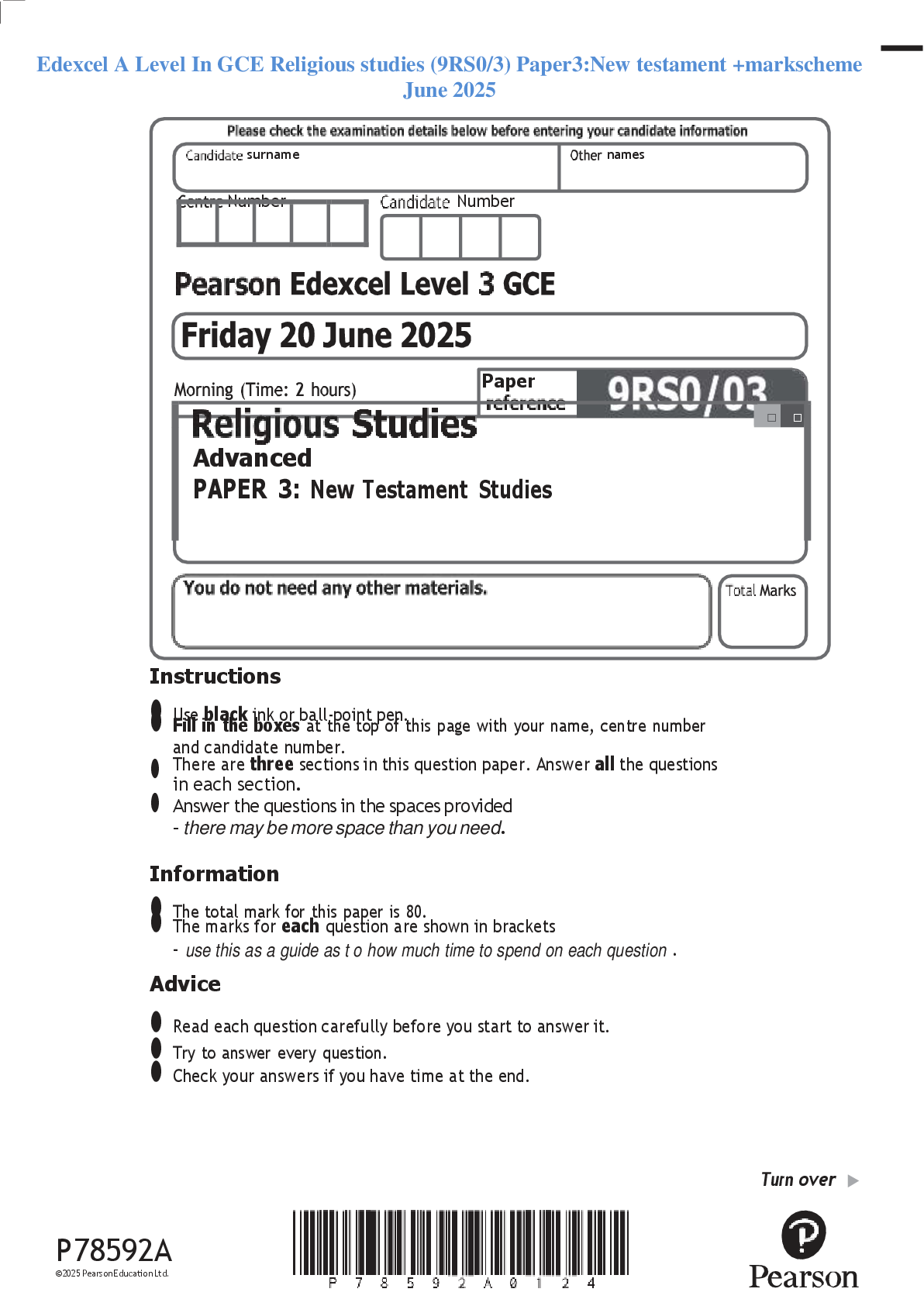 Religious Studies > Edexcel > Edexcel A Level In GCE Religious studies (9RS0/3) Paper3:New testament +markscheme June 2025 (All)